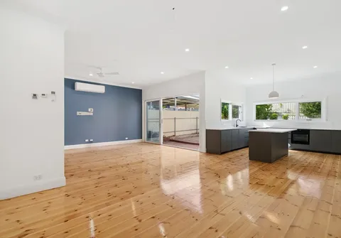 - Open-plan kitchen, family, and dining room with 8kW split-system air-conditioning and ceiling fan