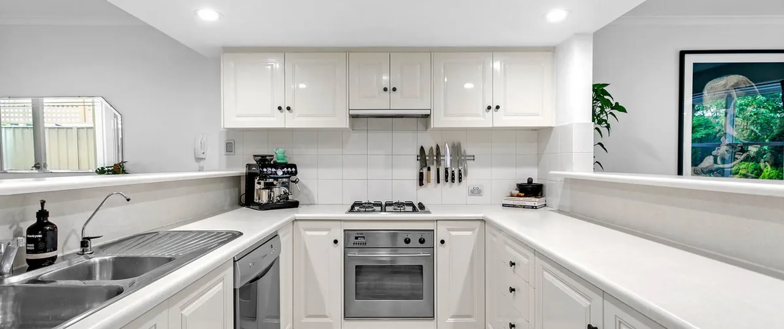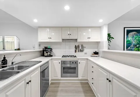 - Modern kitchen with breakfast bar, dishwasher, gas cooktop and ample cupboard and bench space