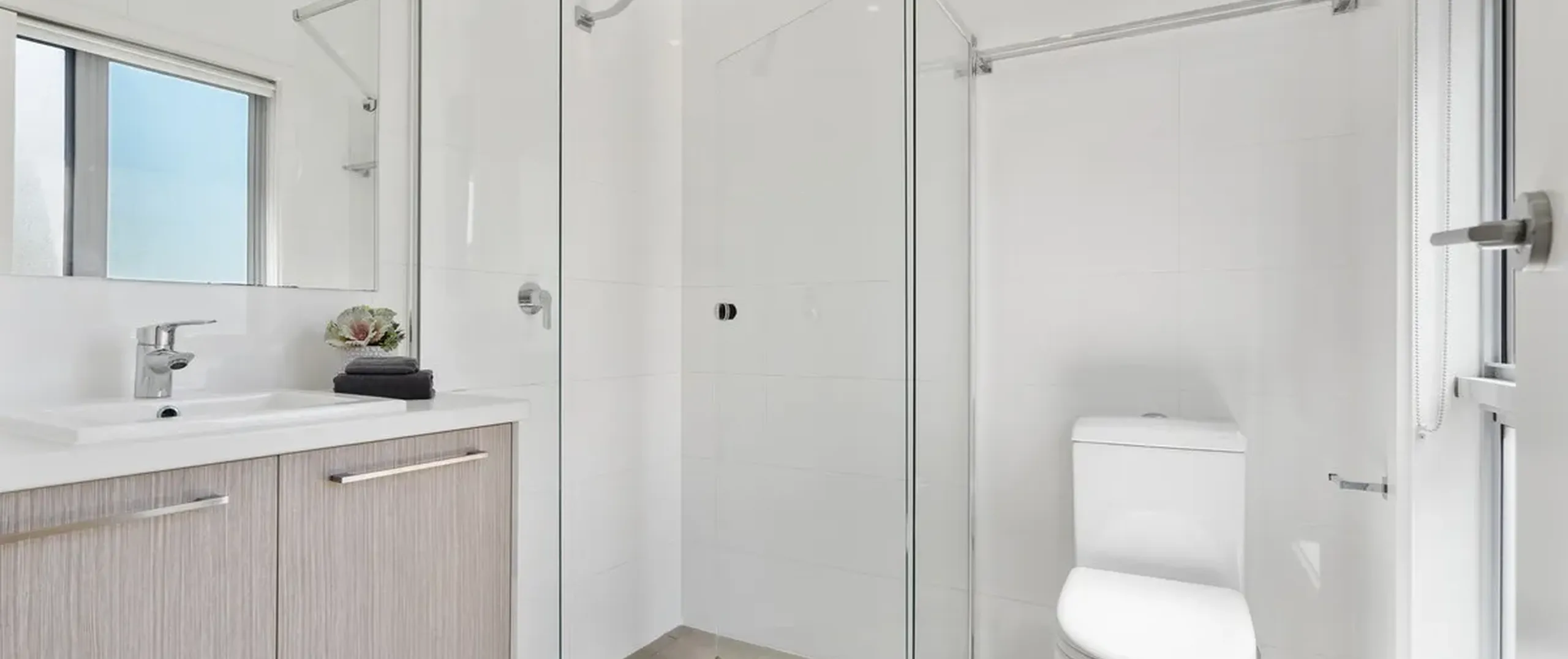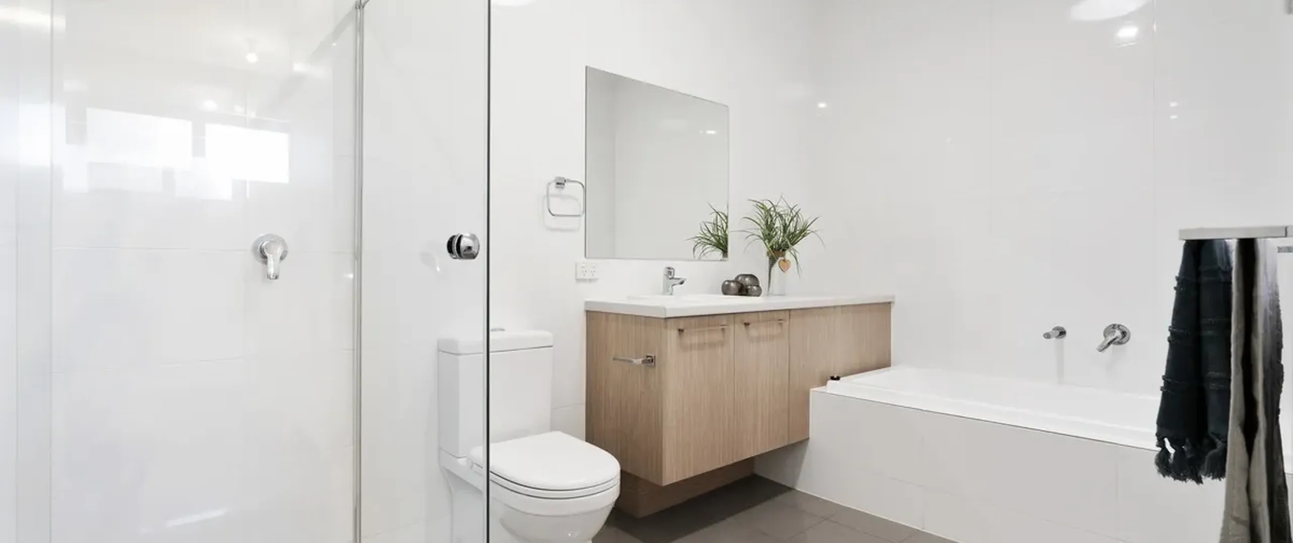 - Large feature mirrors and floor to ceiling tiles in bathrooms