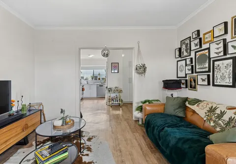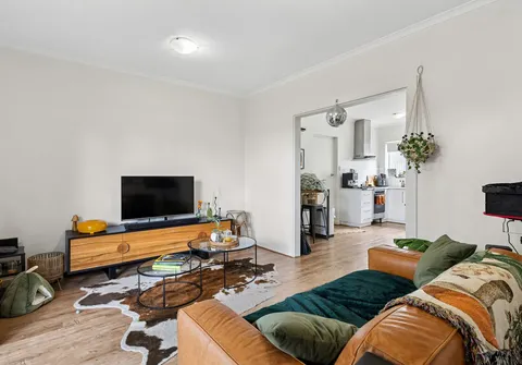 Step inside to find a welcoming lounge at the front, flowing through to the kitchen and meals area, featuring stylish timber floors and split-system air conditioning, with fresh white walls that create a bright, contemporary ambiance.