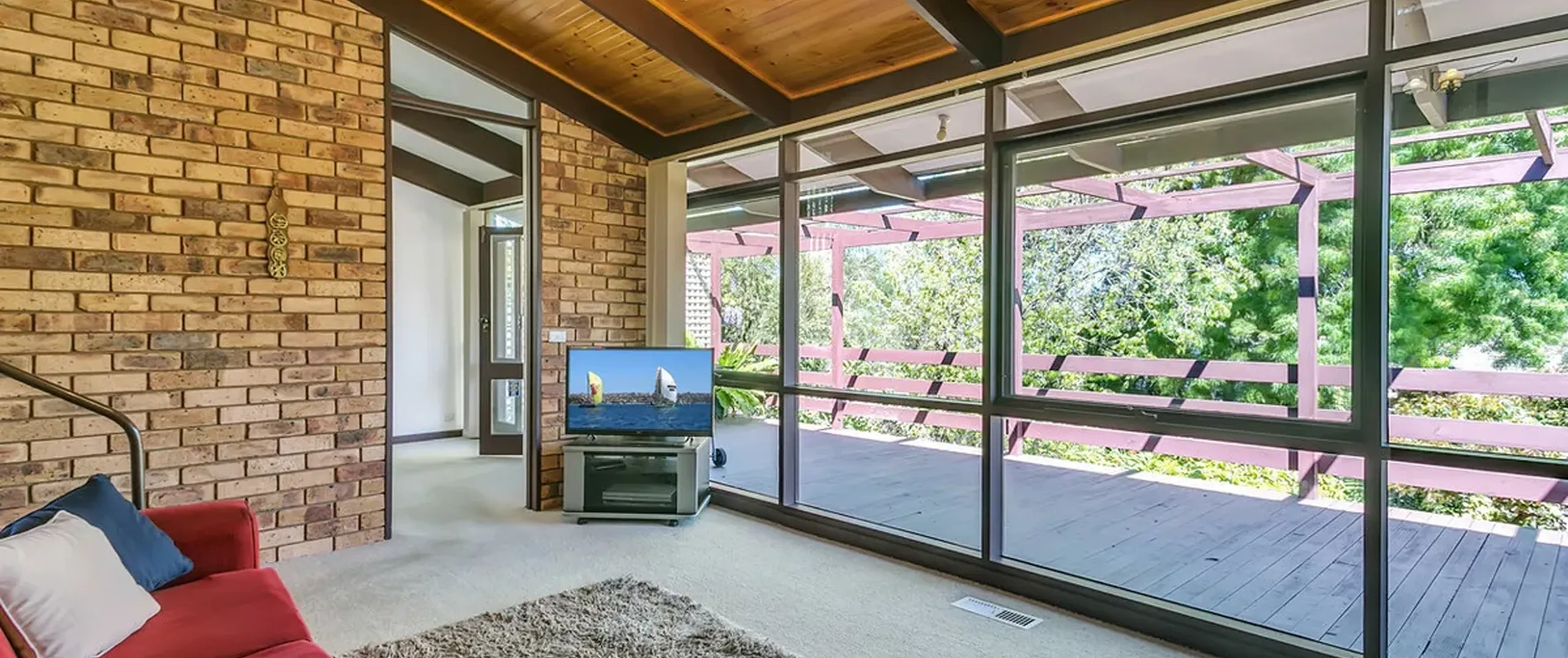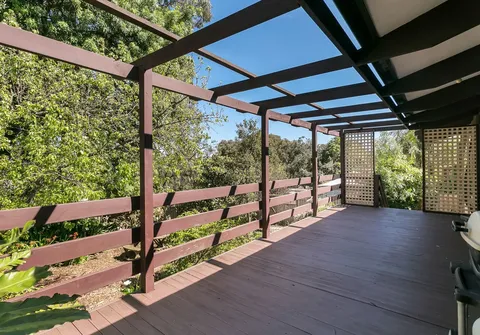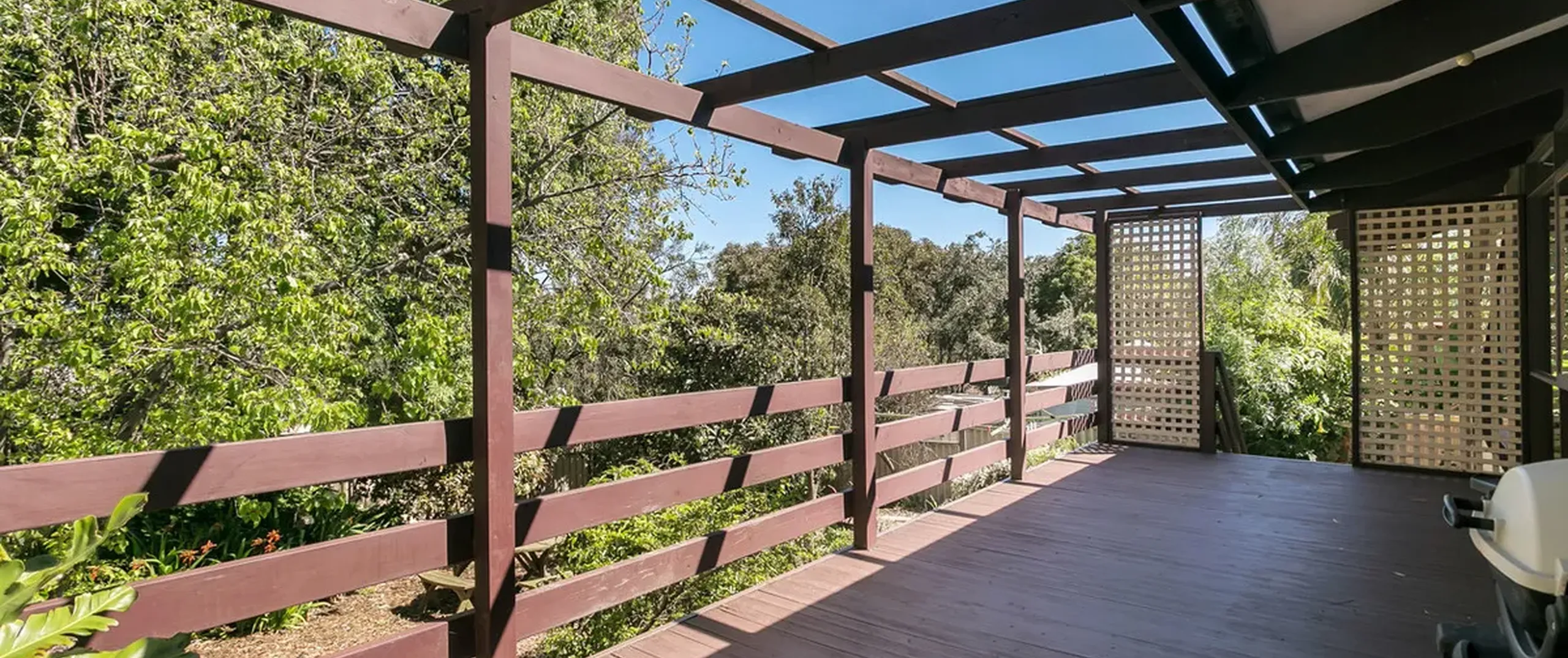 - Expansive pergola with deck overlooking the rear yard