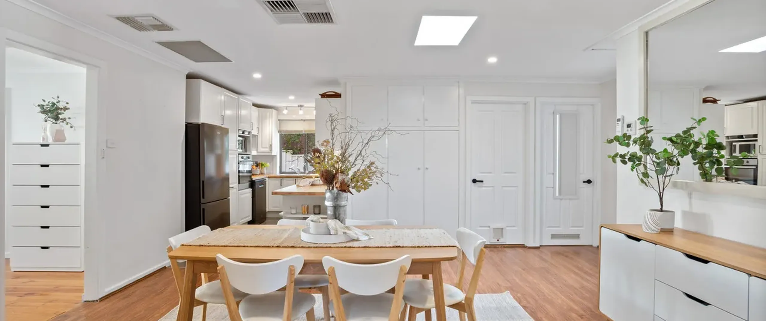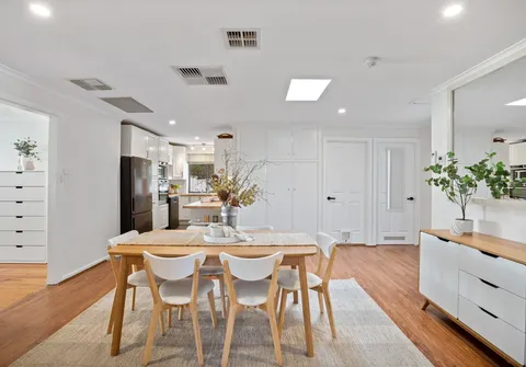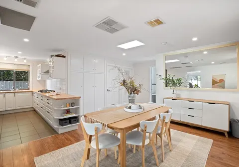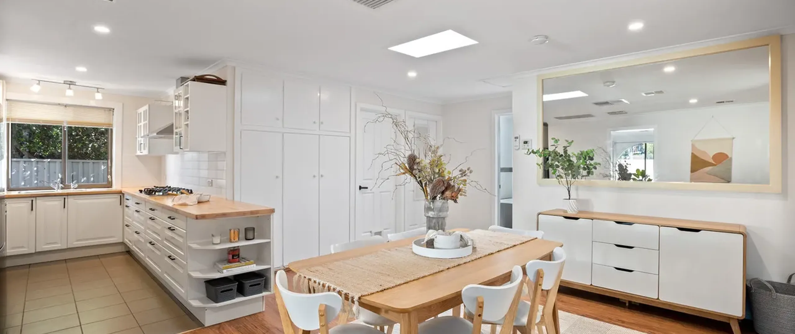 - Divine open plan dining and kitchen with air conditioner and flooded with natural light from the sky light
