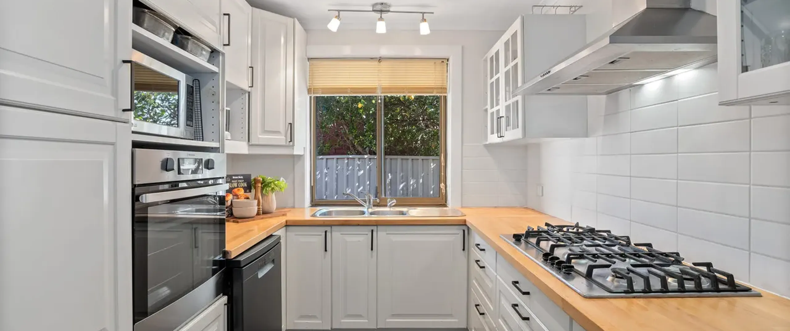 - Stylish contemporary kitchen with dishwasher, gas cooktop, ample cupboard space, pantry, sweeping benchtops and completed with chic matte black fixtures and finishes throughout