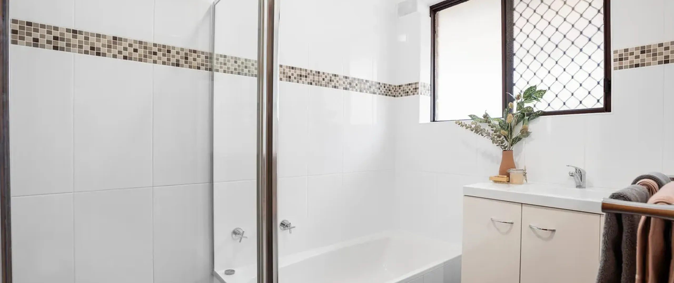 - Sparkling bathroom with bath and shower + separate toilet and linen storage