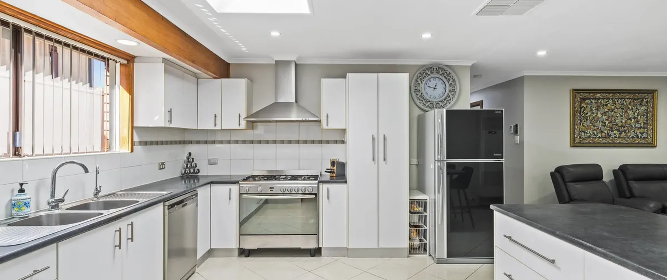 - Timeless white kitchen with stainless steel dishwasher, 900mm gas cook top and oven, complete with ample cupboard and bench space
