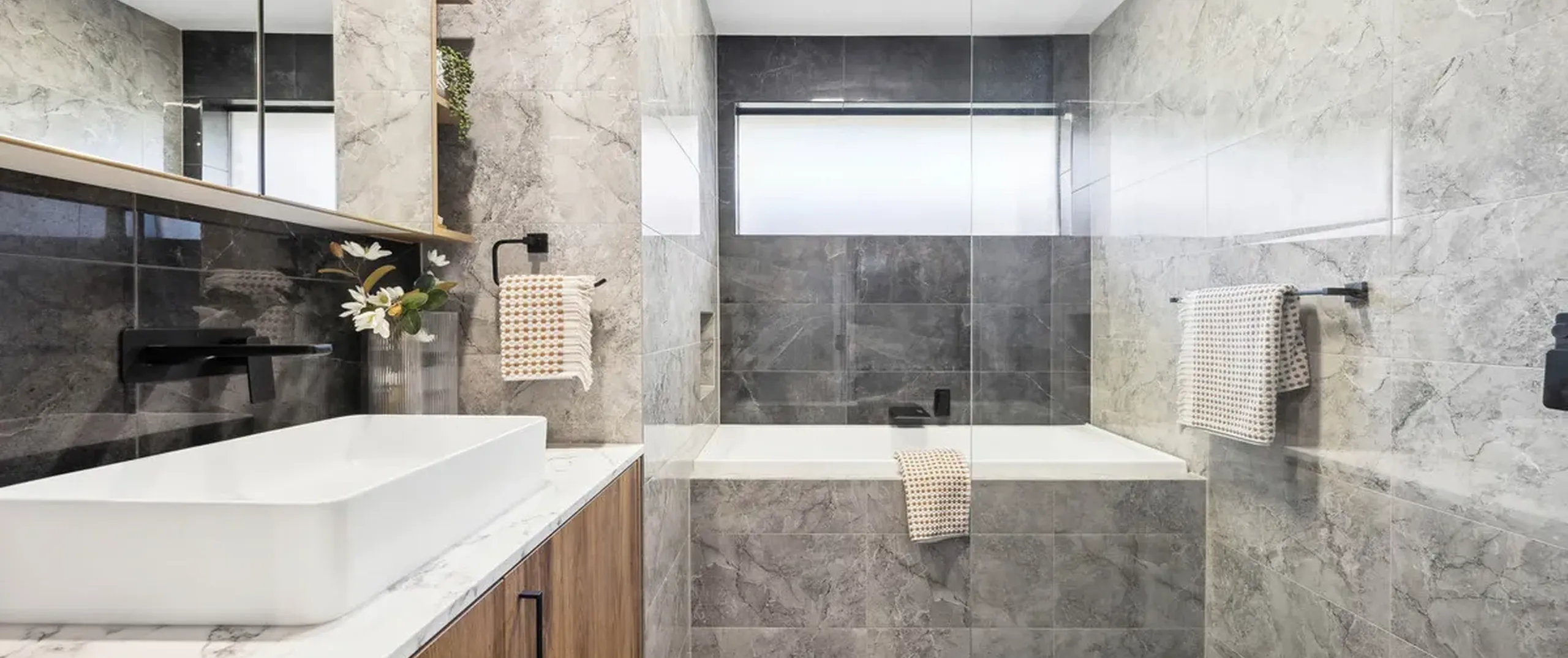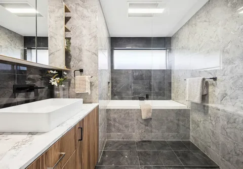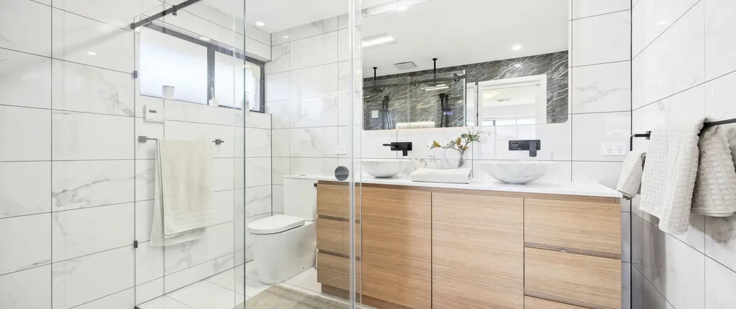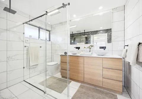 - Master bedroom with built-in robe and ensuite featuring floor to ceiling tiling, dual basins and shower heads