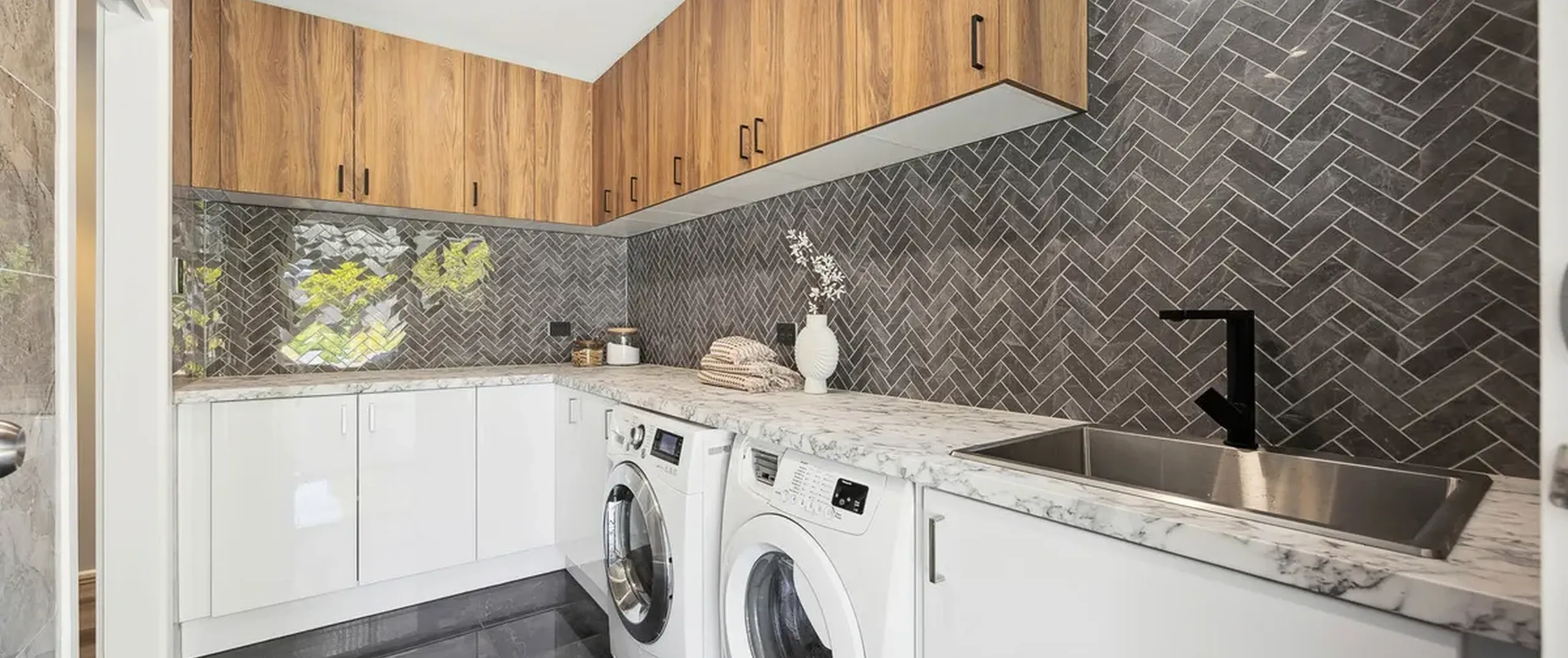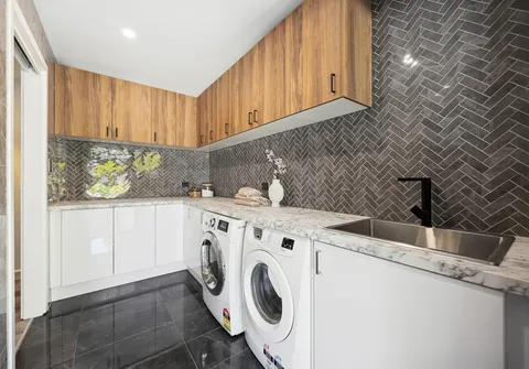 - Stylish laundry with direct access to rear yard and verandah; featuring floor to ceiling tiling, splash back and custom joinery