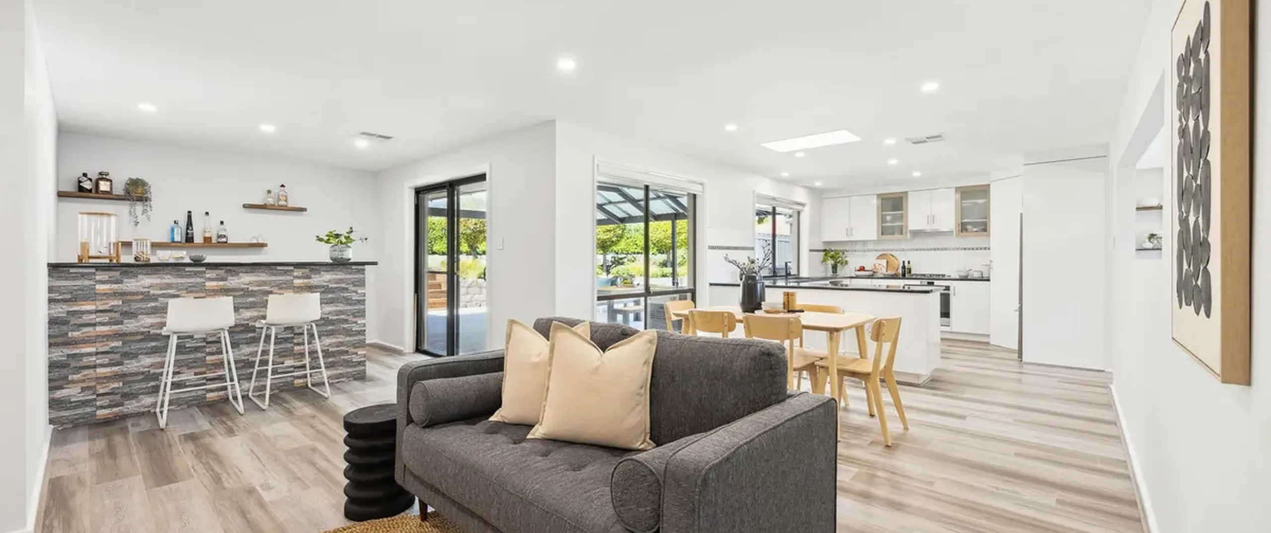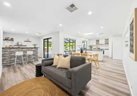 - Light filled open plan living, dining, bar and kitchen area with downlights