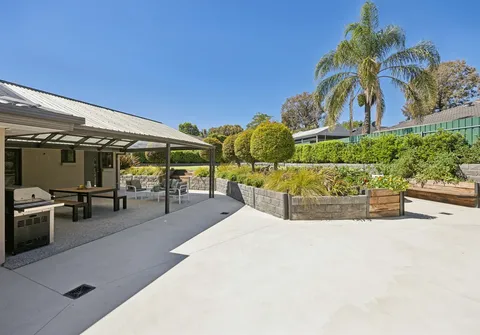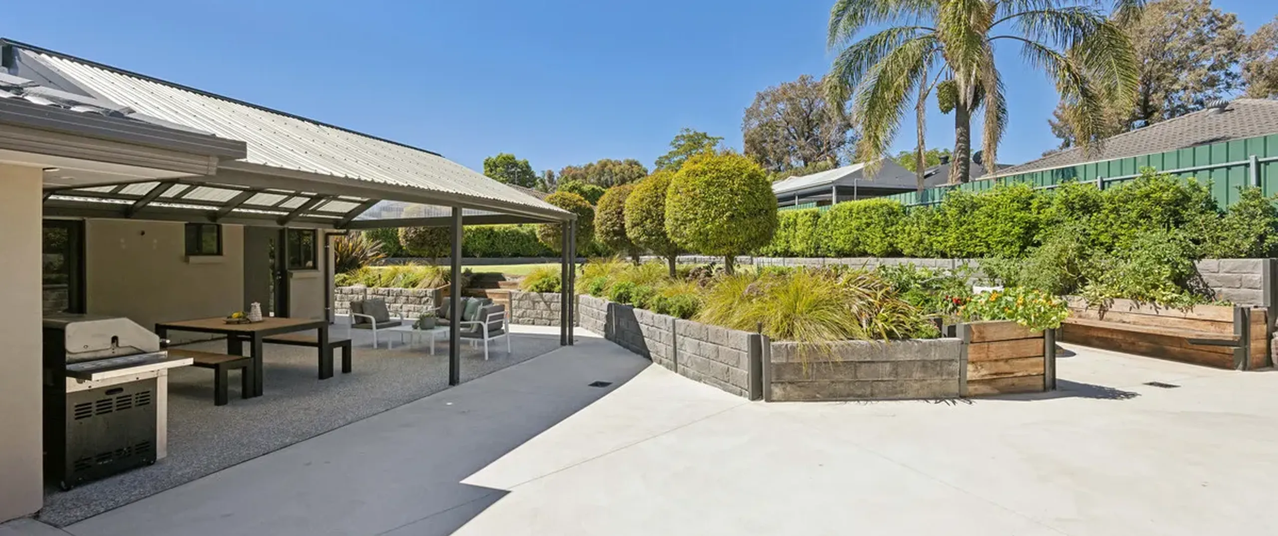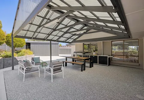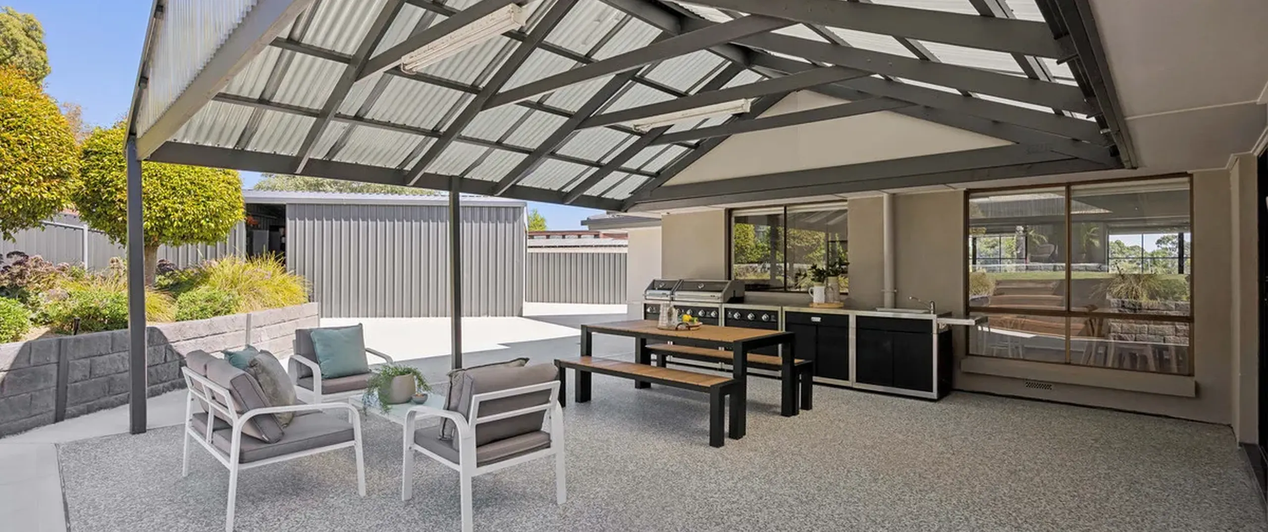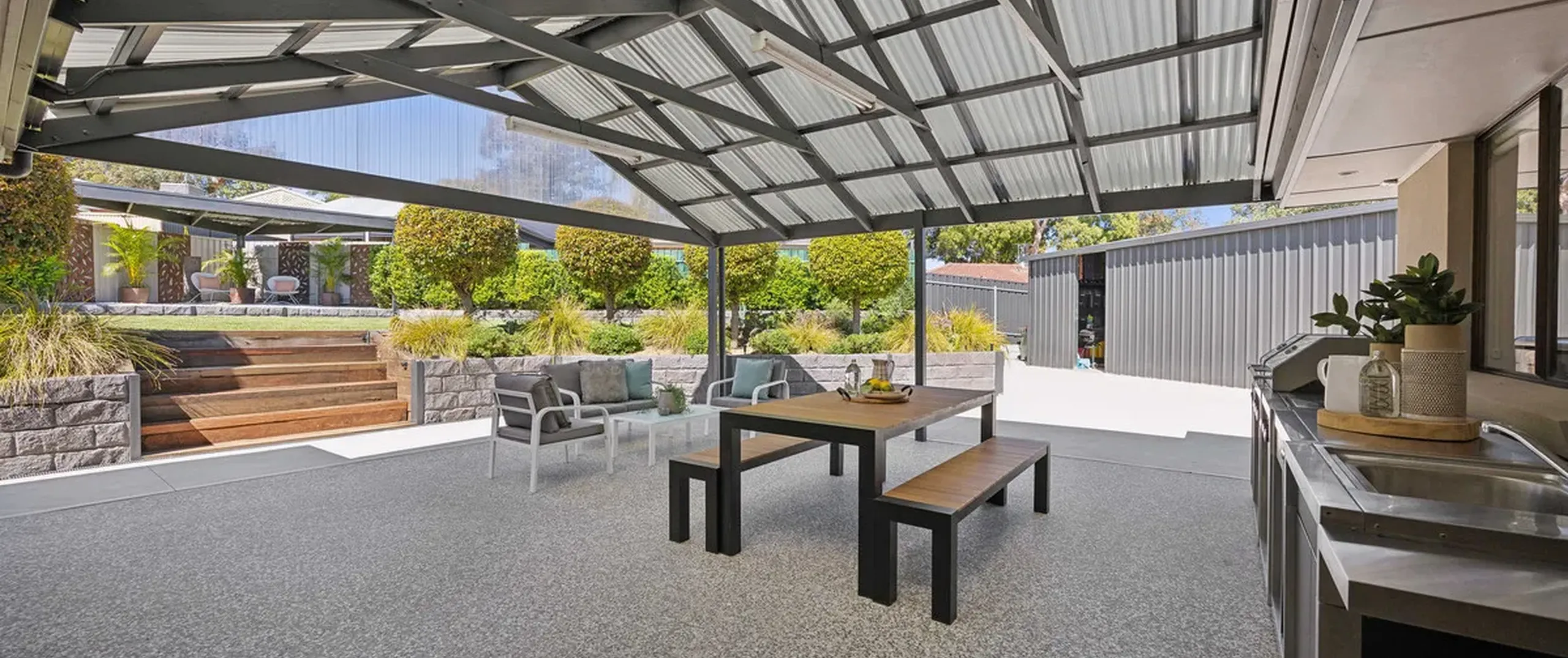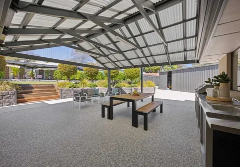 - Expansive undercover outdoor entertaining area with exposed concrete mix and honed smooth, led baton lights and pitched roof verandah