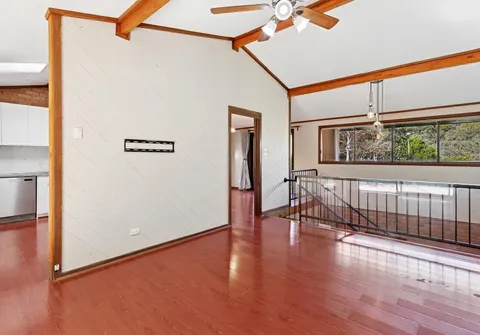 - Light-filled lounge room with ceiling fan, striking timber beams and direct access to the expansive verandah