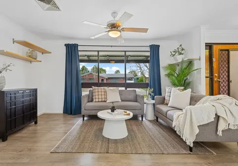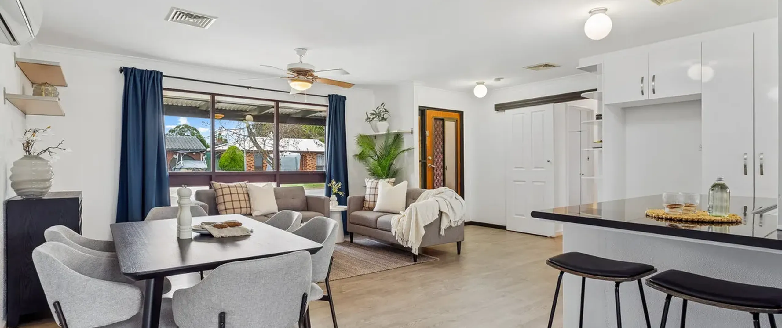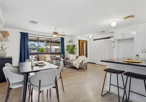 - Open-plan living area creates a warm and welcoming atmosphere, featuring a light-filled lounge with ceiling fan, seamlessly flowing into the dining and kitchen spaces