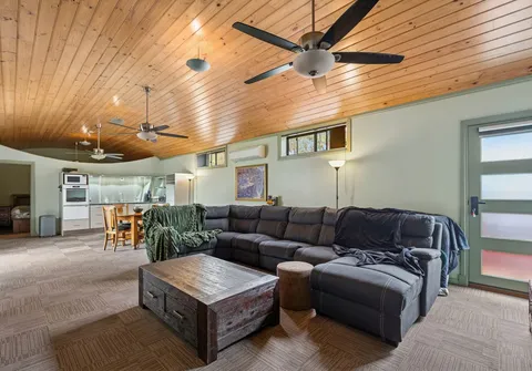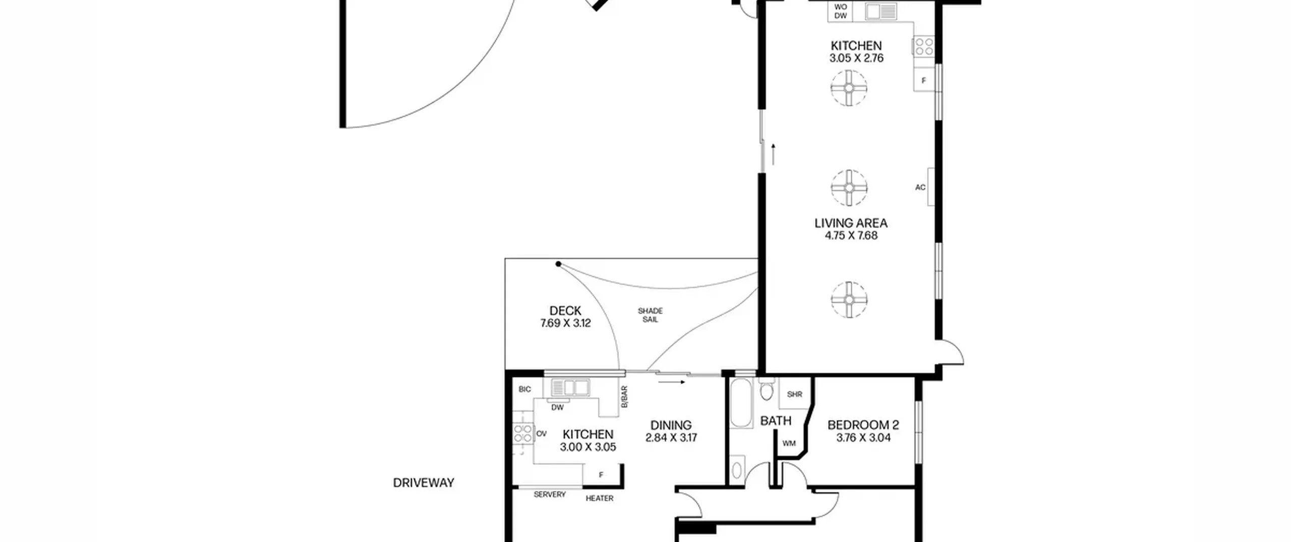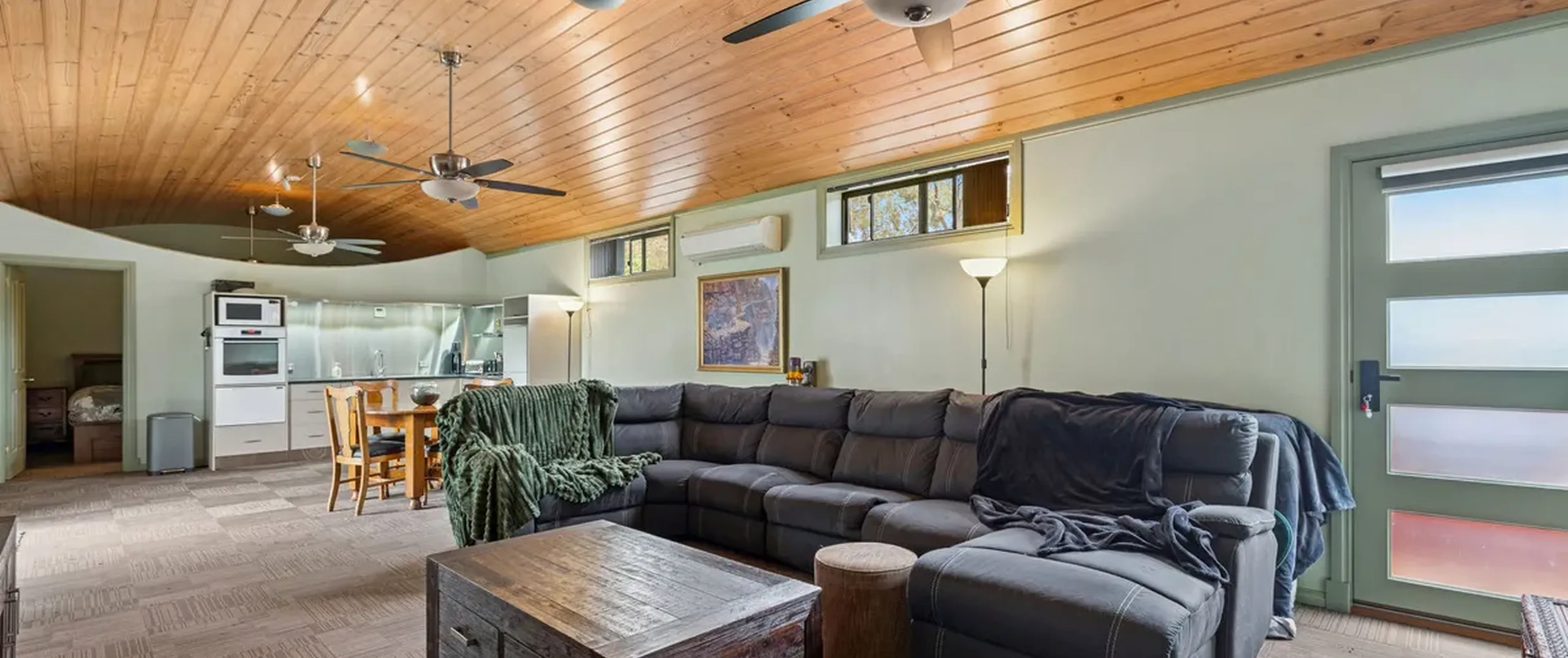 - Open plan living and kitchen with three ceiling fans