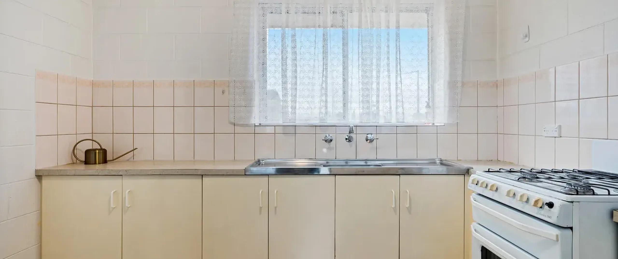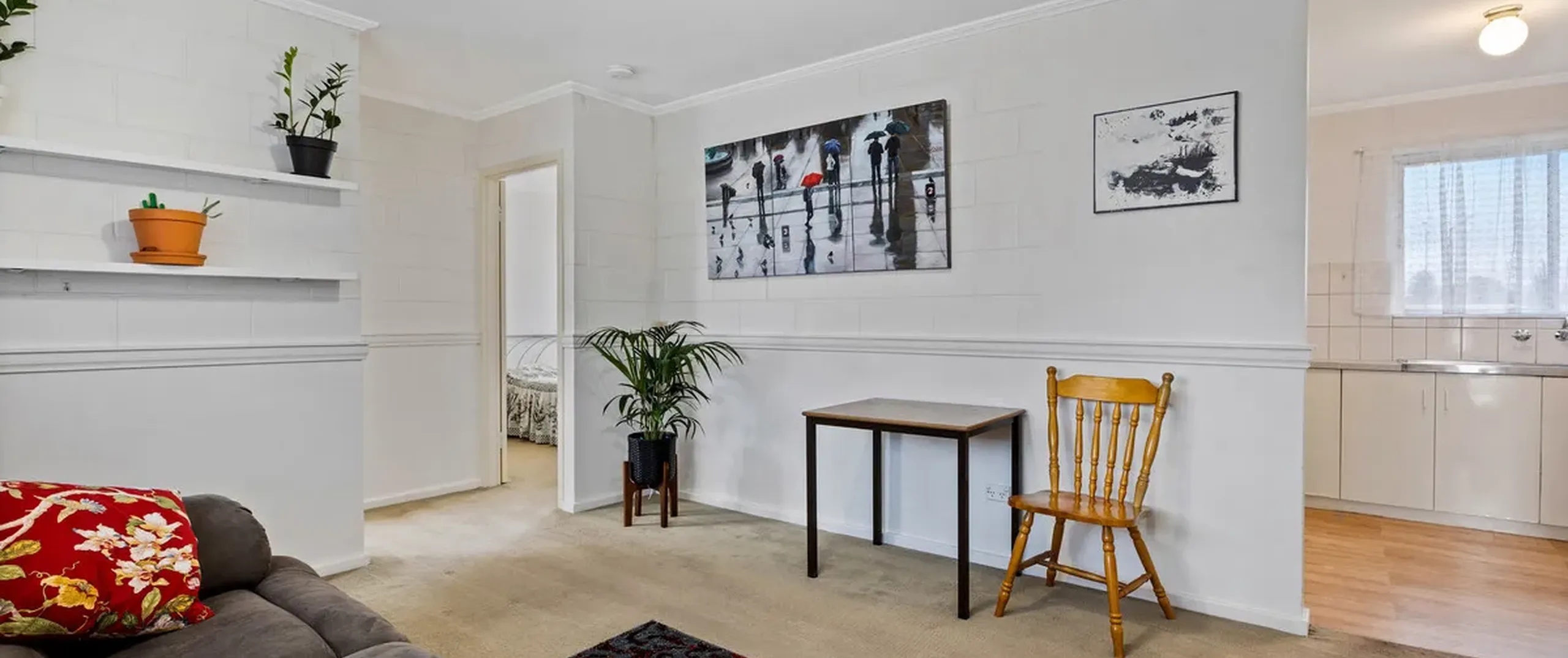 The layout offers two bedrooms and one bathroom as well as a light-filled lounge room, plus a spacious dine-in kitchen. Here, gas cooking and ample storage await while a central main bathroom with incorporated laundry completes the floorplan.