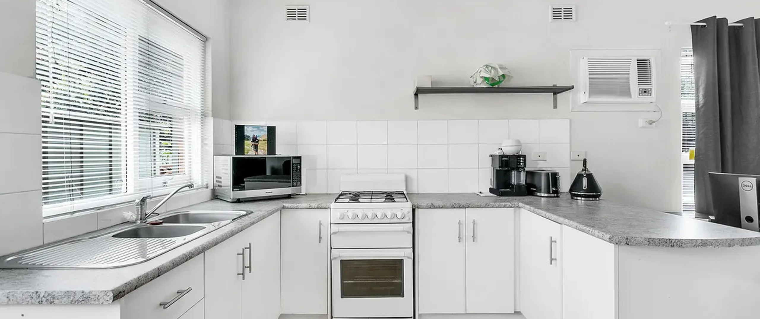 - Contemporary kitchen with gas cooktop, breakfast bar and ample bench and cupboard space