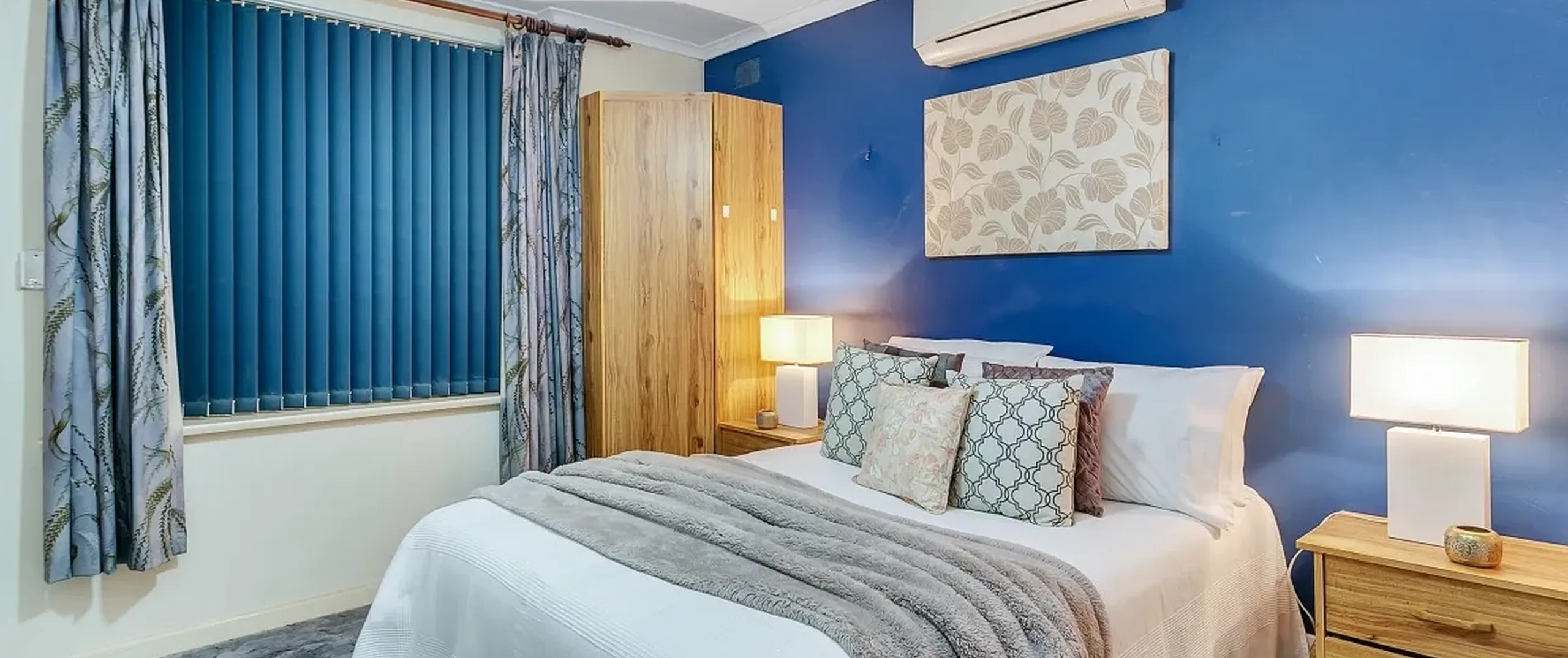 - Master bedroom with split system air conditioner, built-in robes and cupboards and ceiling fan