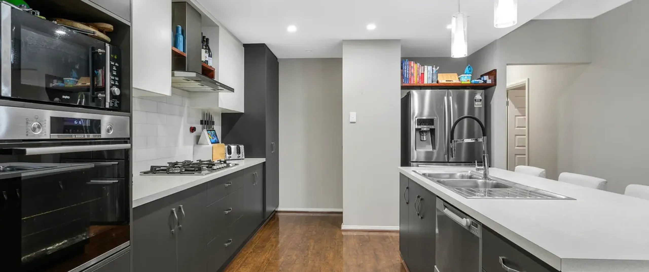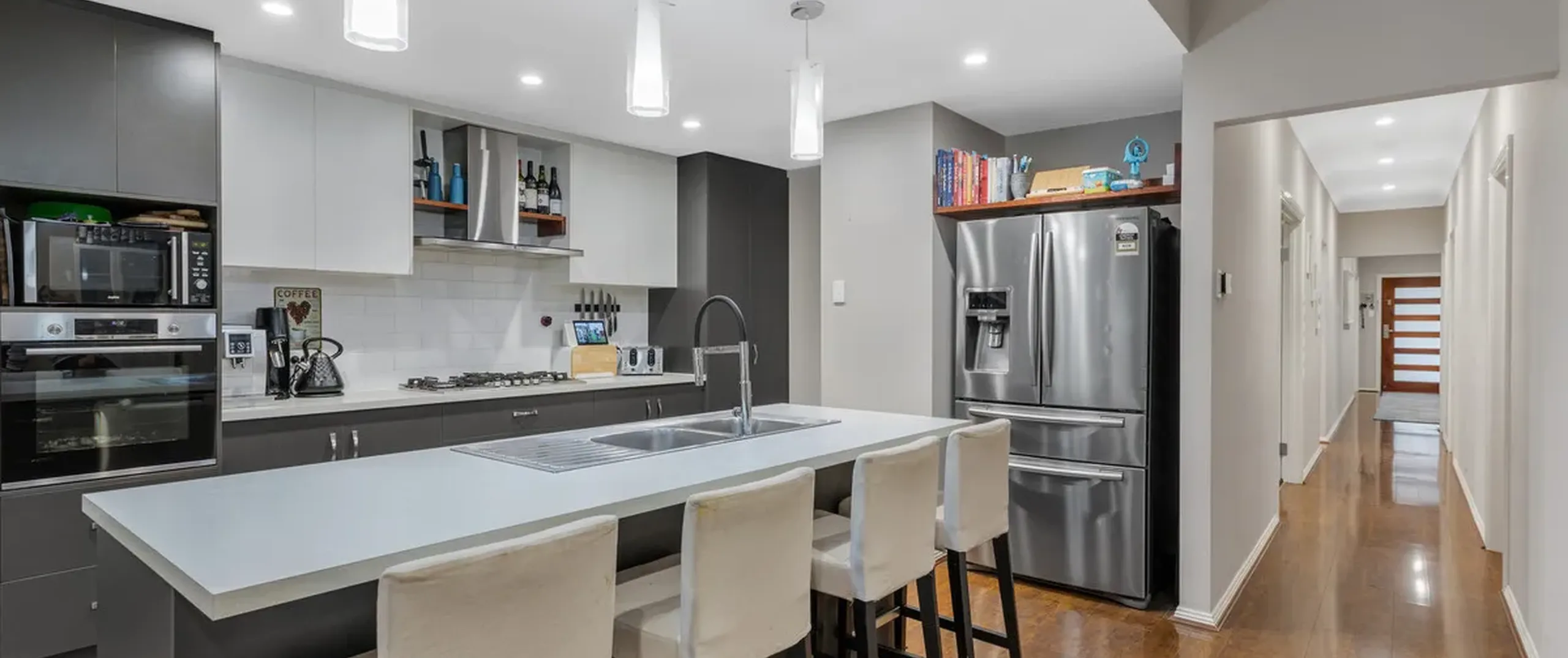 - Stylish kitchen with pendant lighting, stainless steel appliances, pyrolytic cleaning oven, double dish drawer, gas cooktop, island bench and ample bench and cupboard space