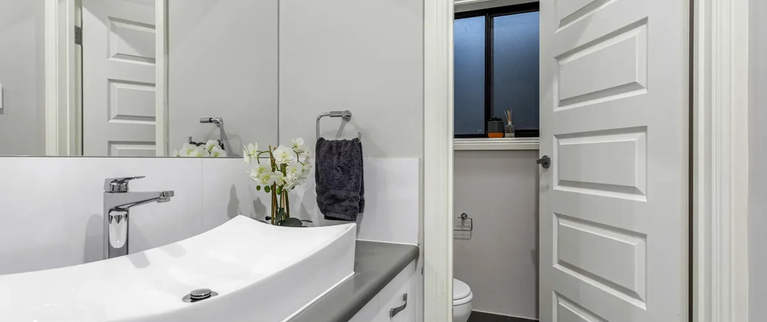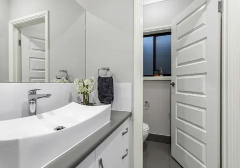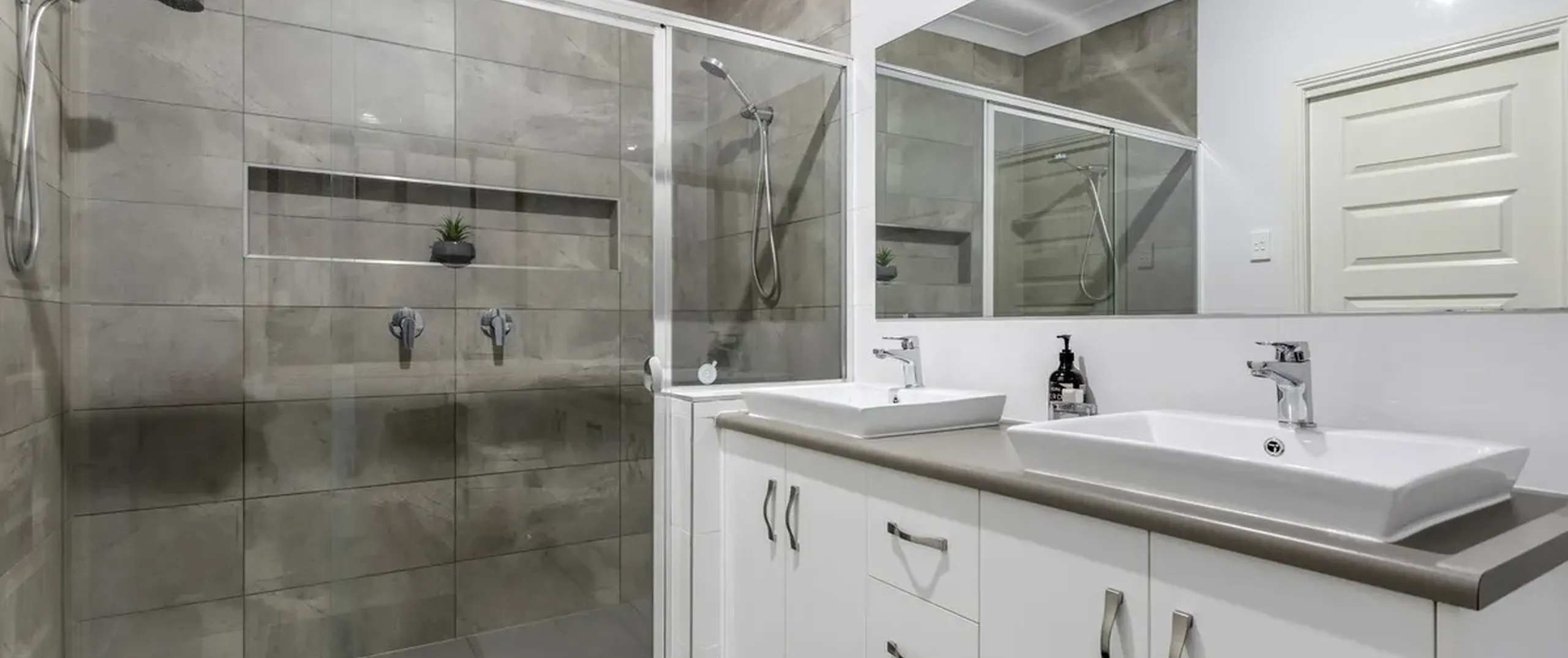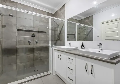 - Master bedroom with large walk-in robe and elegant ensuite featuring floor to ceiling tiling, dual shower with niche and dual basins