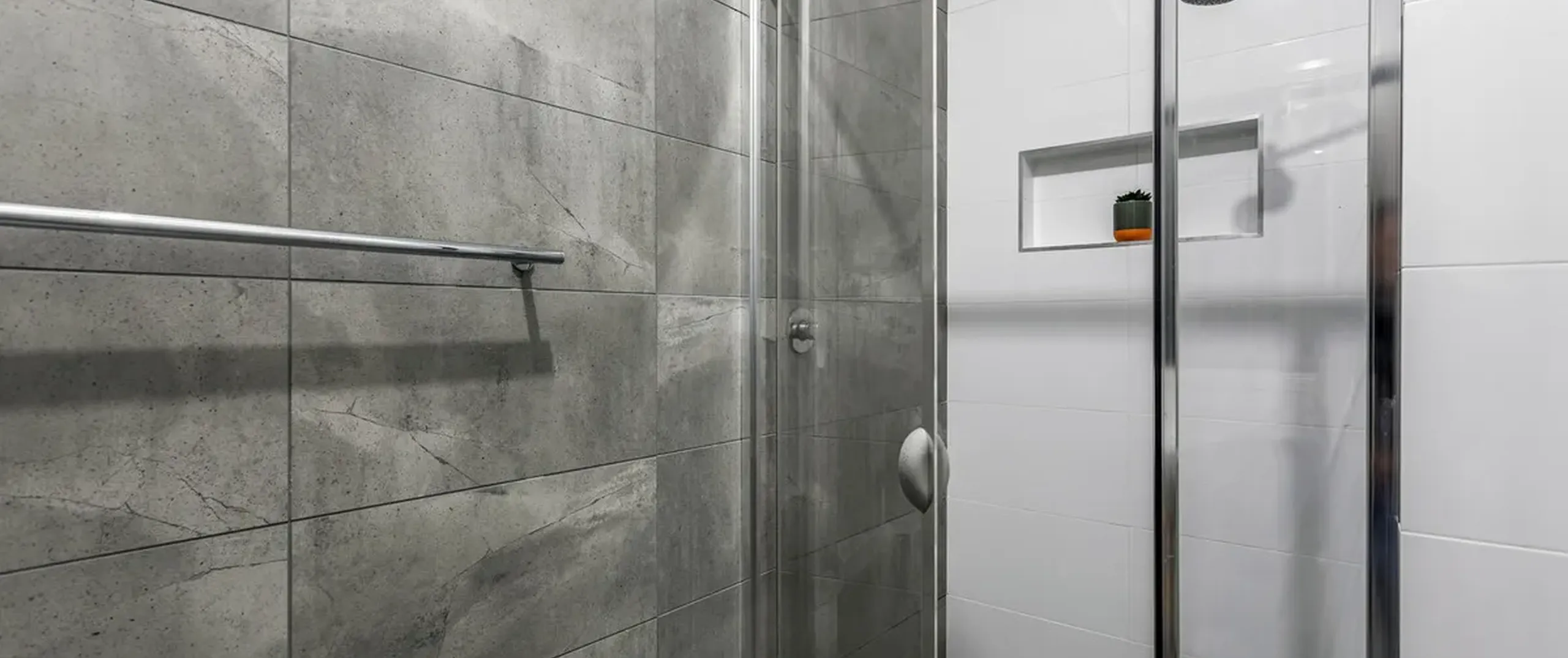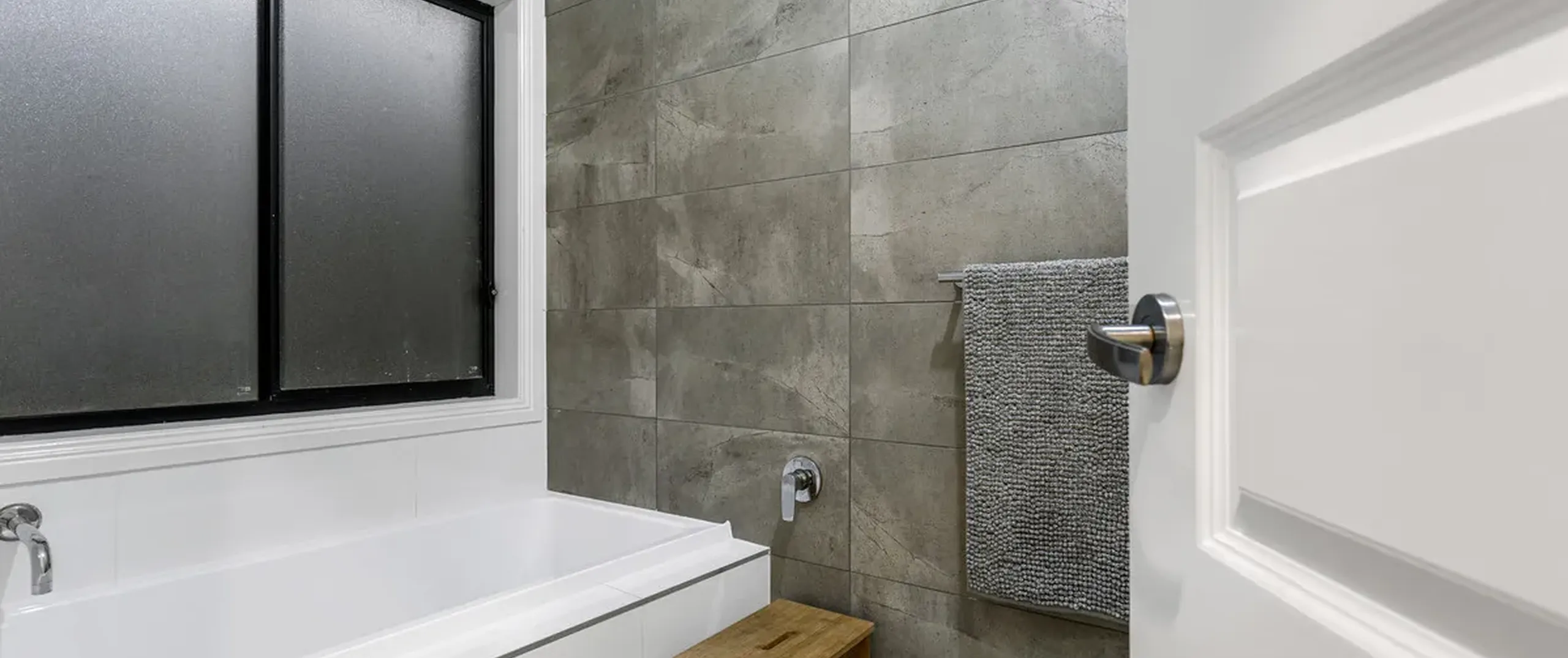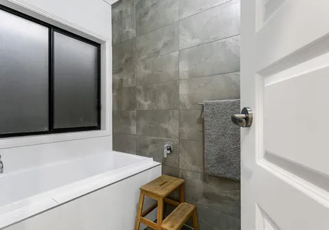- Modern main bathroom with separate bath and shower, featuring floor to ceiling tiling