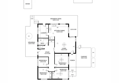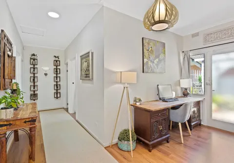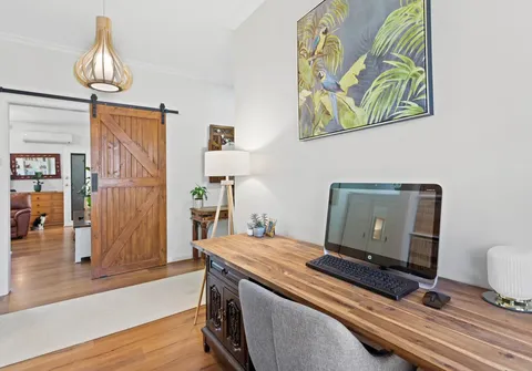Inside this light-filled house, the layout is beautifully presented with four bedrooms, one bathroom and a study area, providing ample space for the whole family. When it’s time to relax, the open plan living awaits complete with a sliding timber barn door, evaporative cooling, split system air conditioners and ceiling fans for year-round comfort. There is also a back-to-base security system installed.