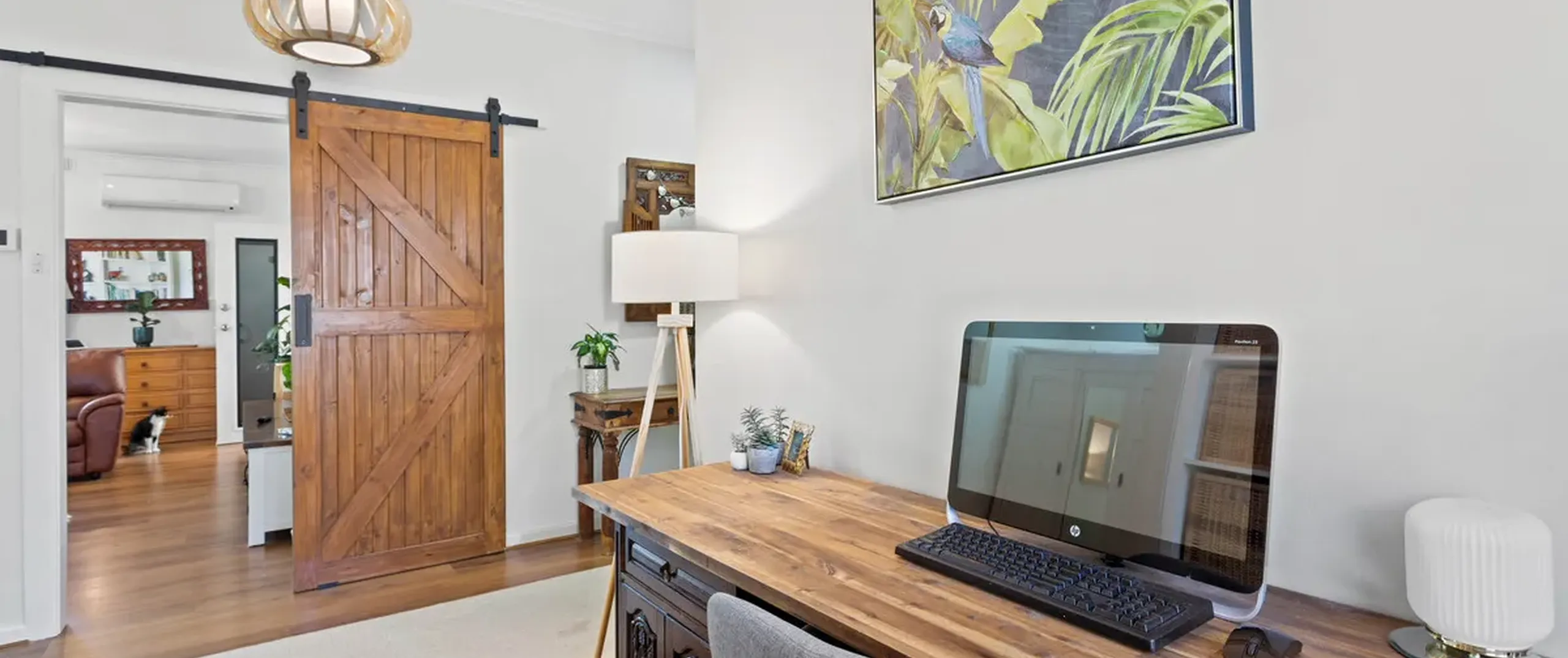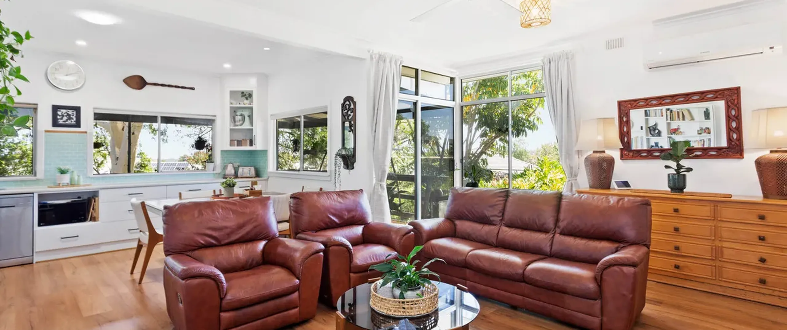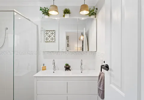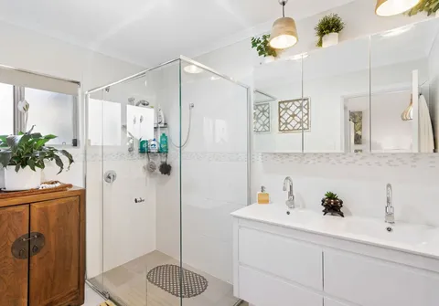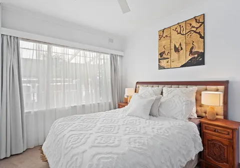 - Spacious light-filled bedroom one, complete with built-in wardrobe and cupboards, ceiling fan and split system air conditioner