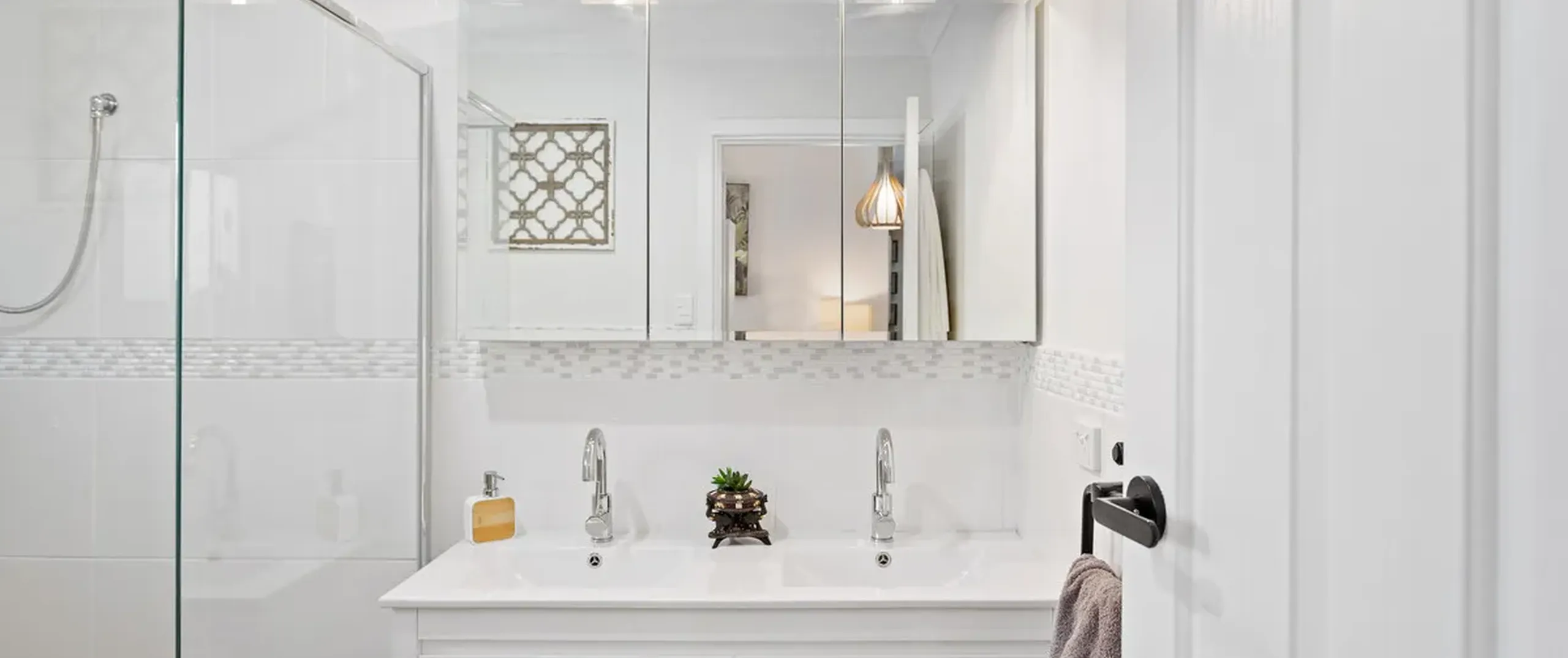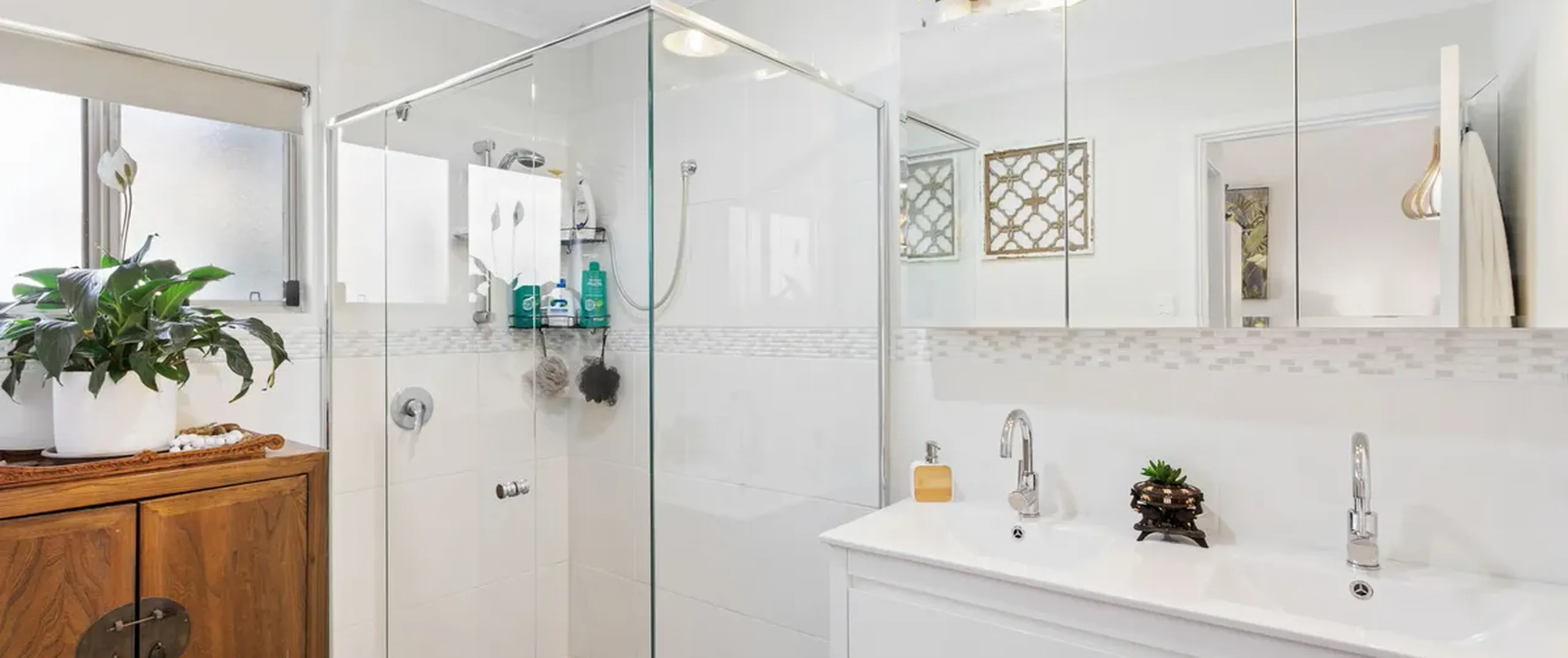 - Well-appointed main bathroom with large shower and double sink vanity