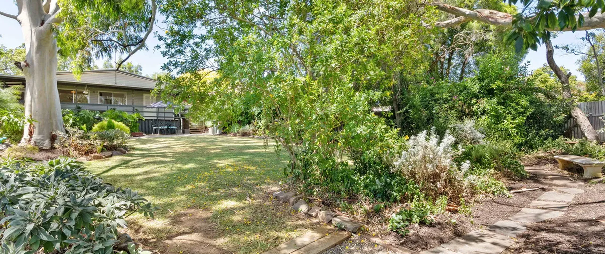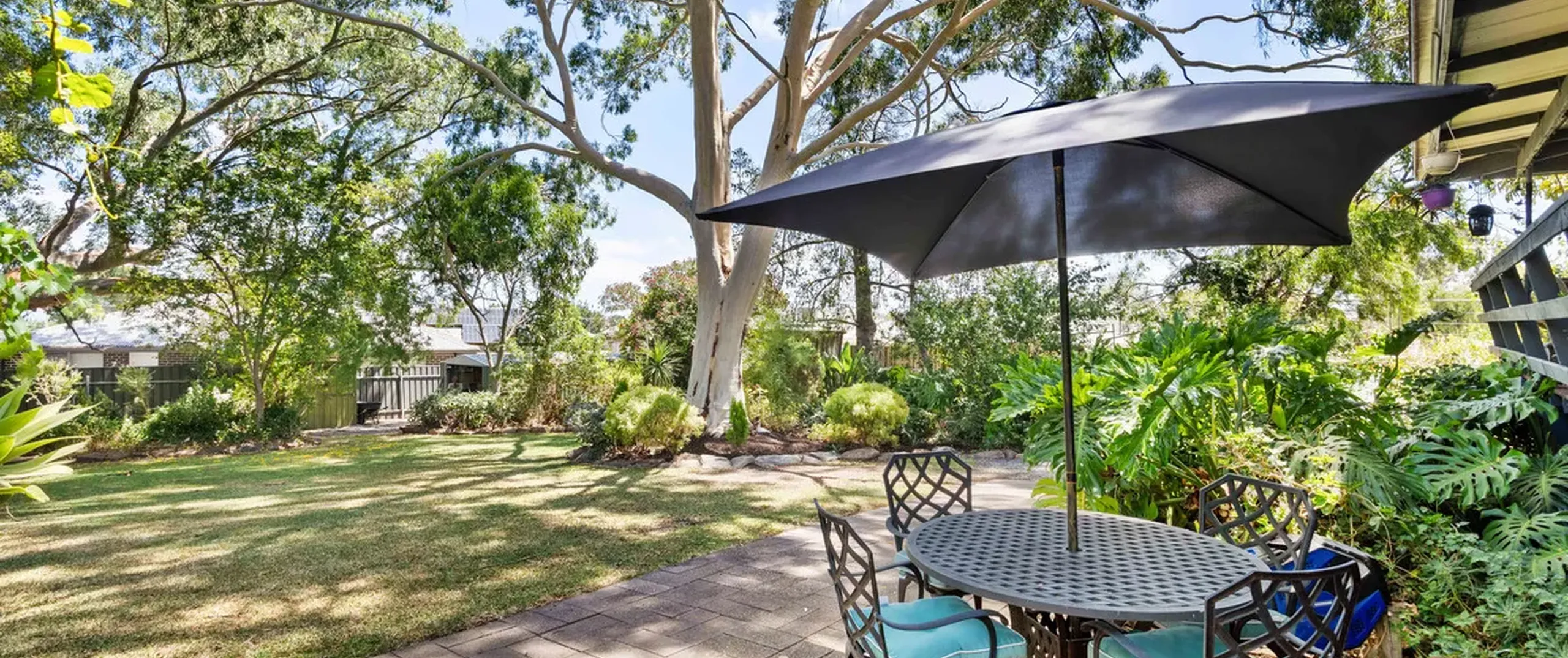 - Large backyard with established gardens