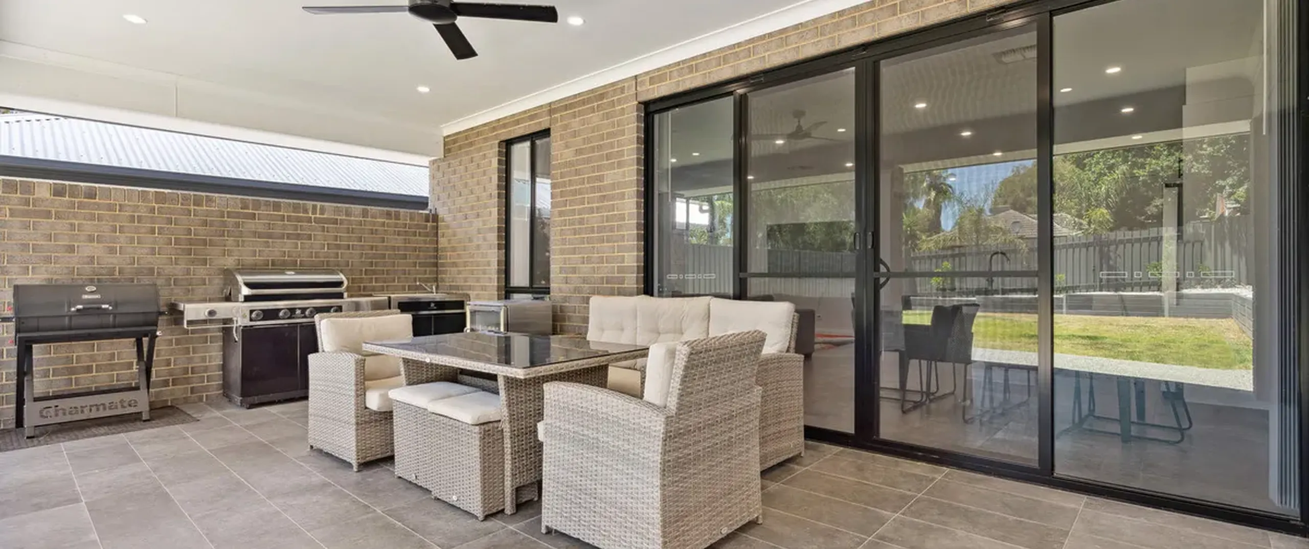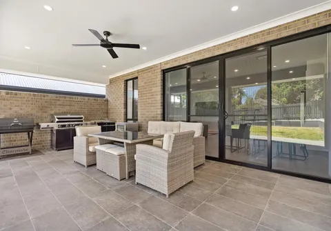 - Tiled outdoor alfresco area with ceiling fan and a Beef Master premium 4 burner BBQ and sink, perfect for outdoor entertaining and daily relaxation