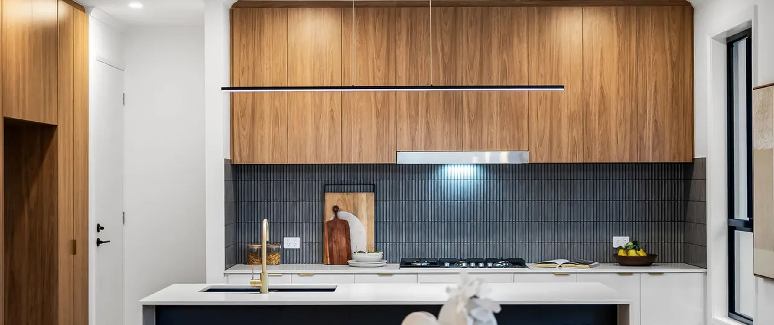 - Boasting an on trend kitchen, featuring American oak cabinetry, feature tiled splash back, brush brass tapware and cabinetry finishes, pendant lighting, a large 900mm Gas Baumatic stove top and oven, dishwasher, fridge alcove and ample pantry space