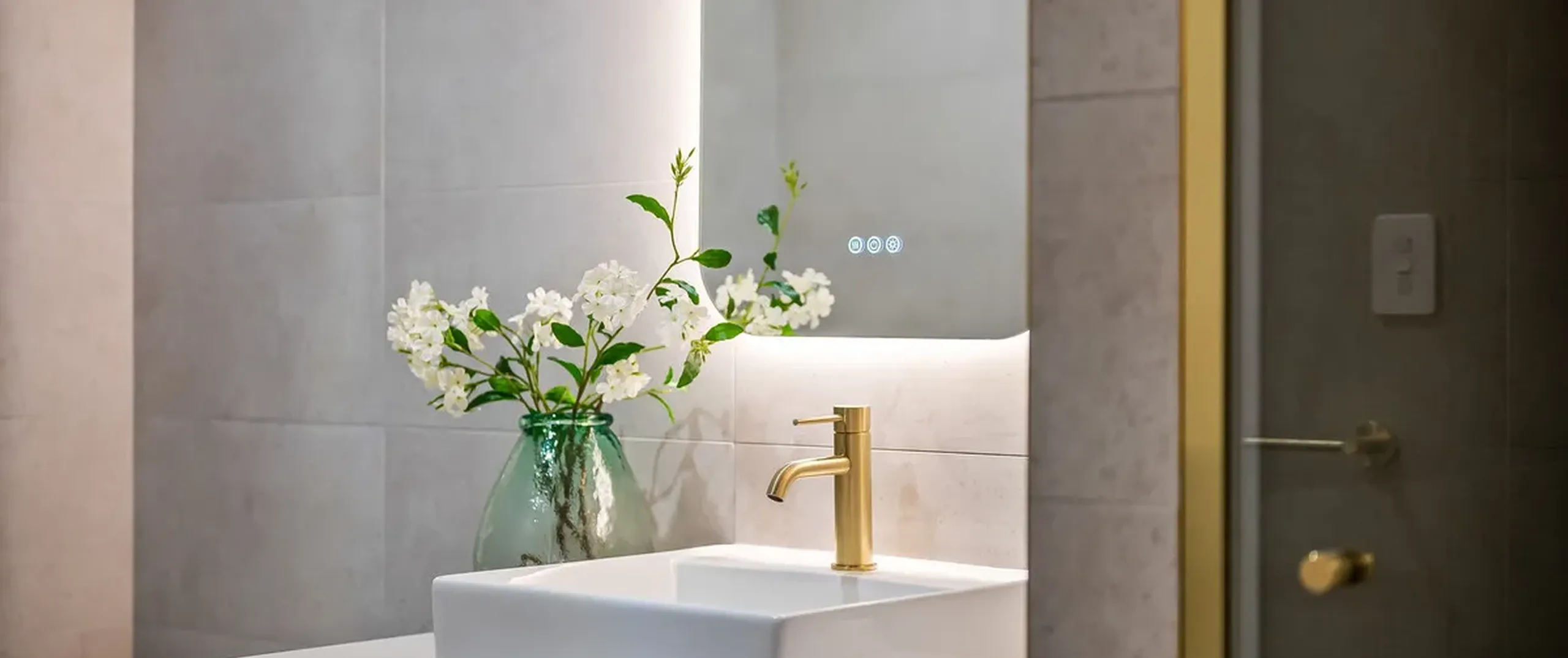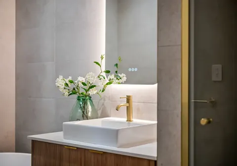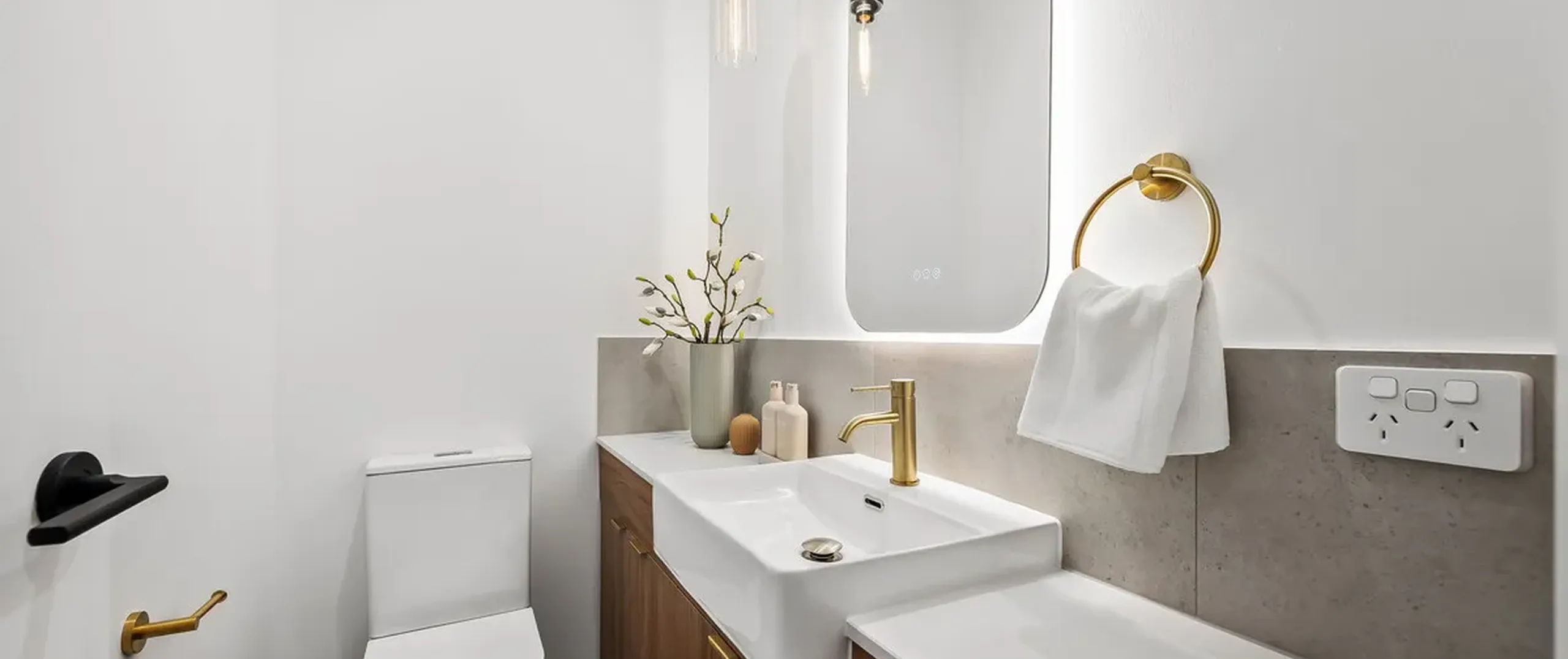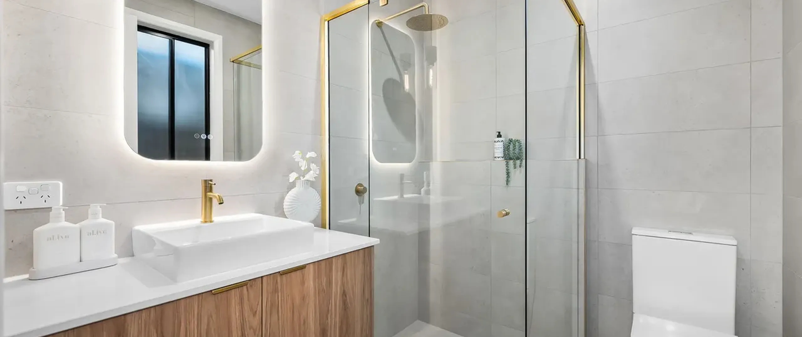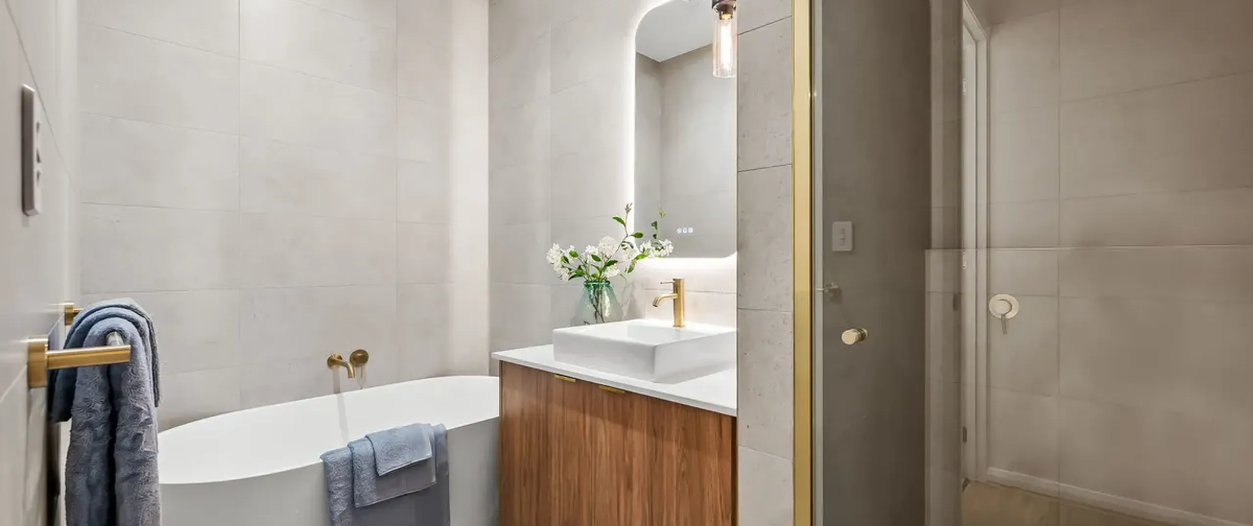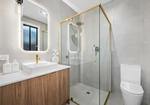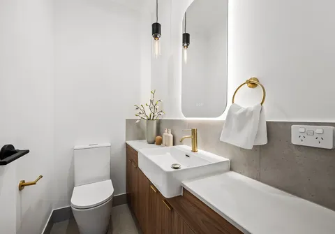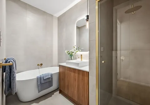 - Main bathroom expertly incorporating, pendant lighting, floor to ceiling tiles and brush brass touches from all tapware to the framed shower screen, freestanding bathtub, separate toilet for added convenience and back lit electric mirror. .