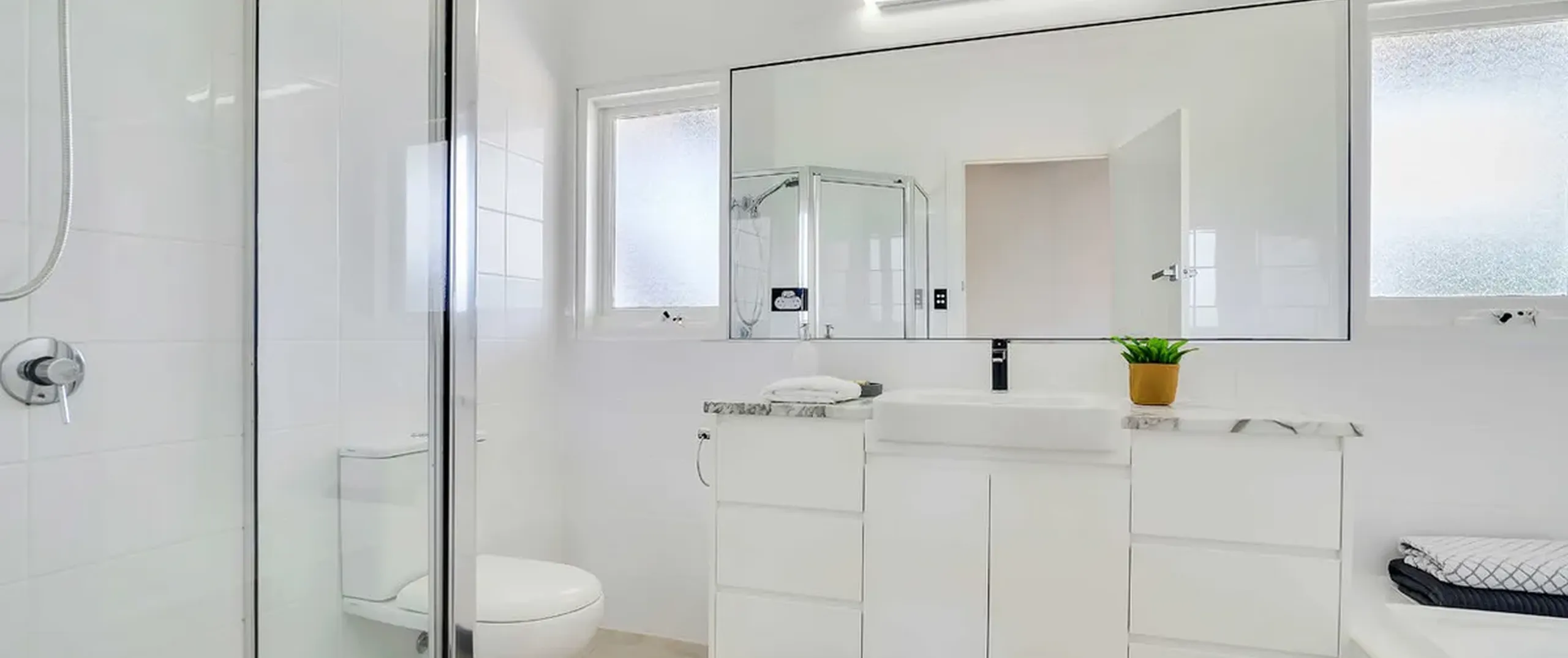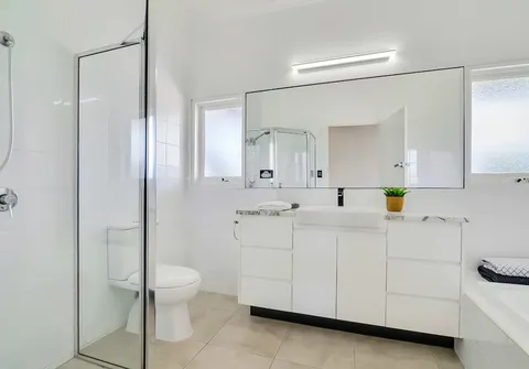 - Sparkling main bathroom with marble benchtop and separate bath and shower with floor to ceiling tiles