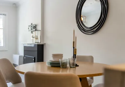 - Light filled, open plan living and dining room with gas heater and ceiling rose