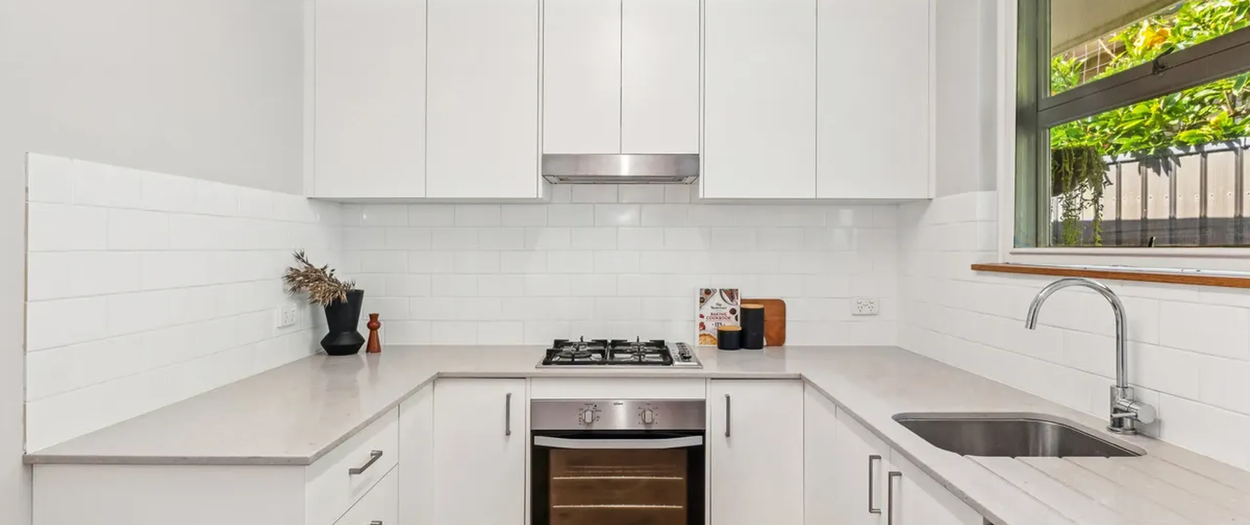 - Trendy and neutral kitchen featuring a suite of stainless-steel appliances including oven, gas cooktop, and dishwasher with ample cupboard and bench space