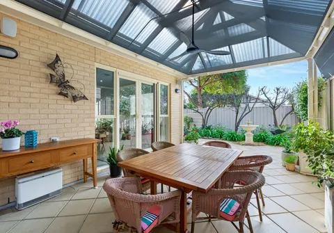 - Expansive outdoor entertaining area with pitched roof pergola, complete with a gas port for the use of a BBQ and a ceiling fan, providing the perfect space to entertain