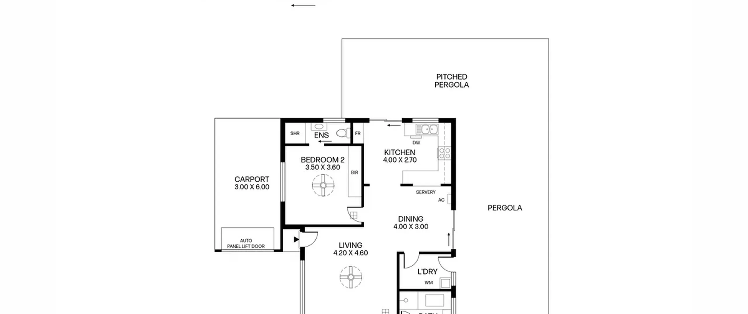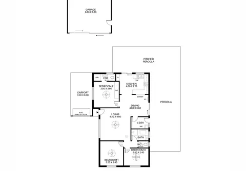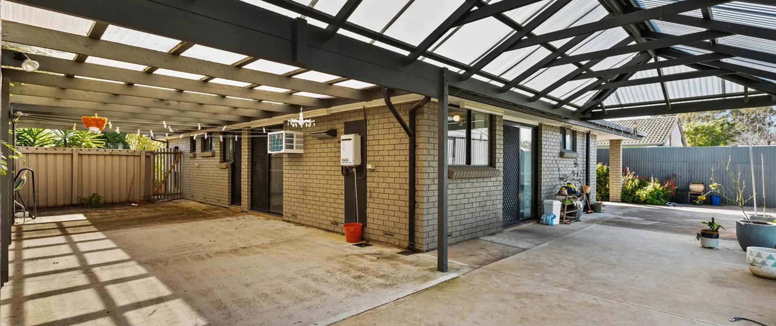- Secure single carport with automatic panel lift door and drive through access to garage for additional parking