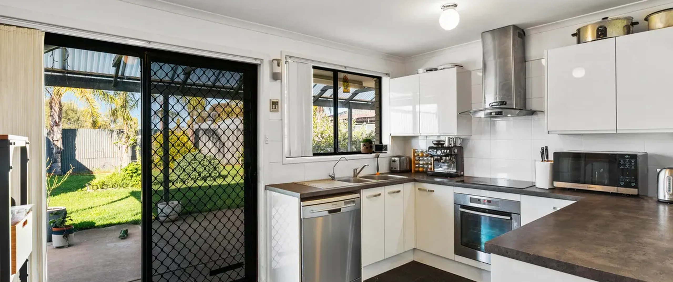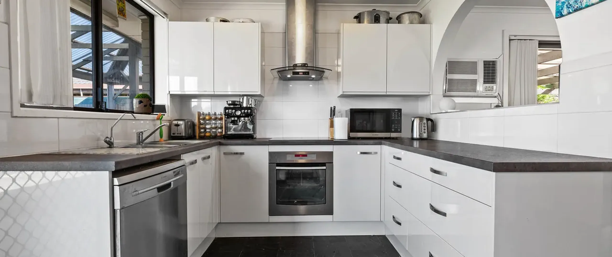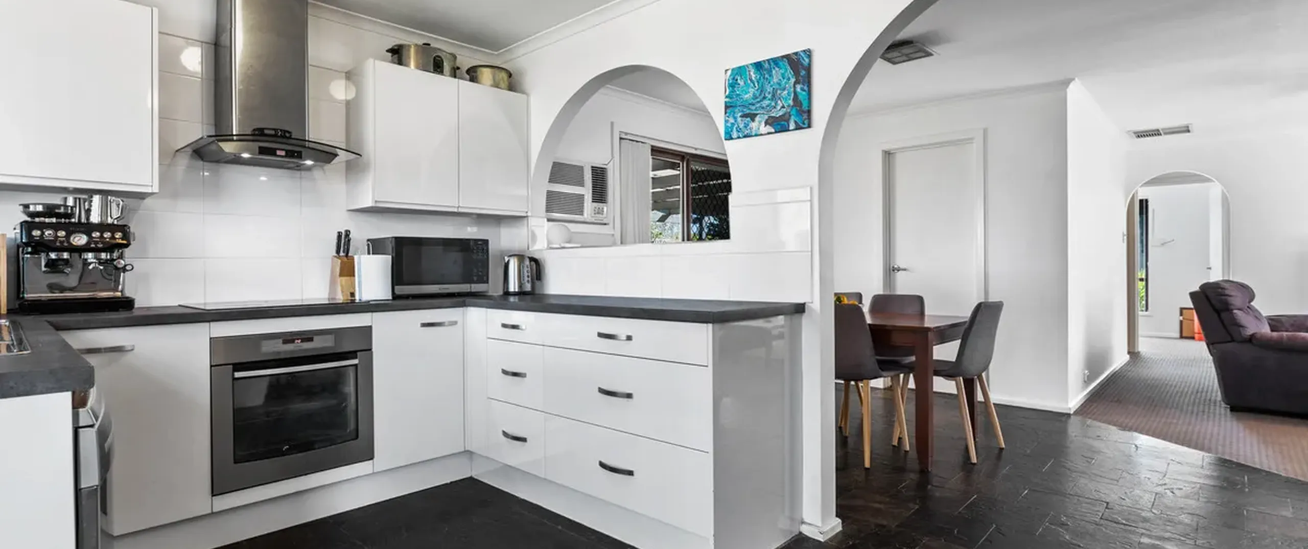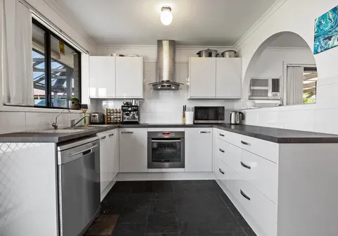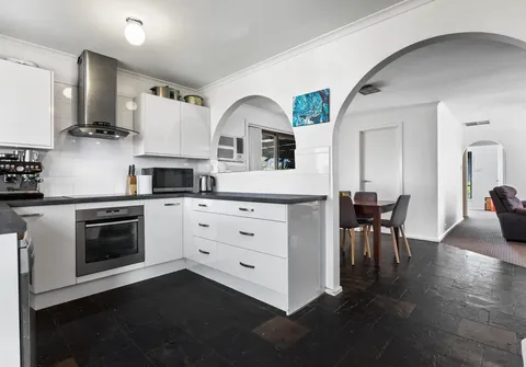 The kitchen boasts sweeping benchtops, stainless steel appliances and gleaming white cabinets plus there’s slate flooring and decorative arches for a touch of character. You can gather with loved ones in the dining room and living area or step outside to the large entertaining space and host guests in absolute style.