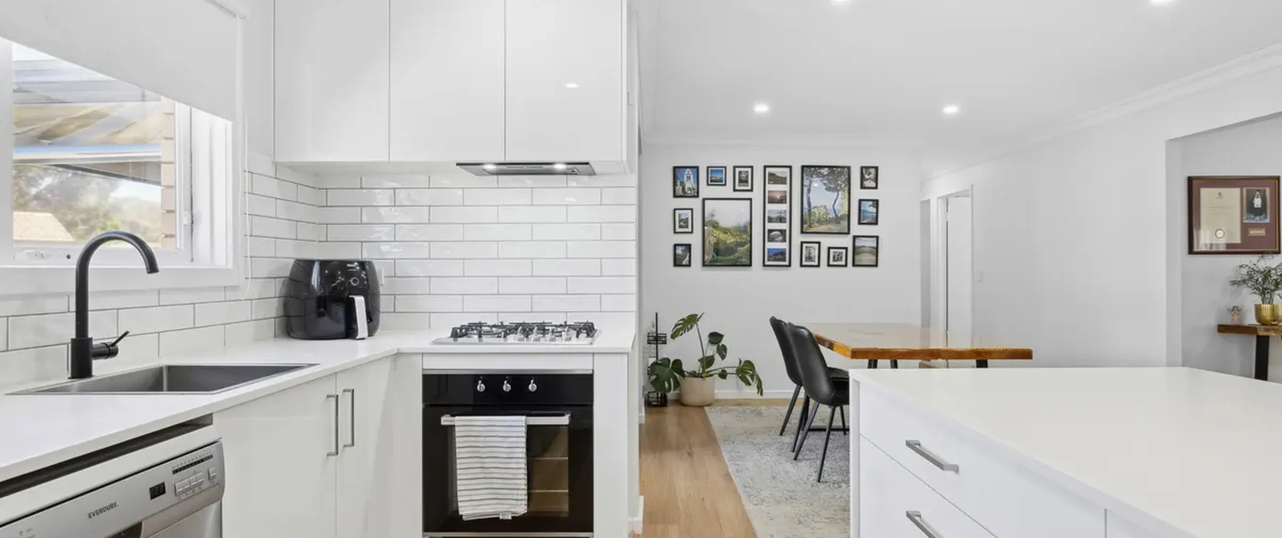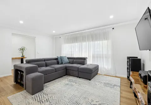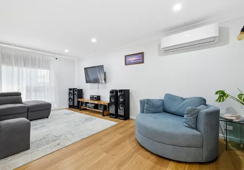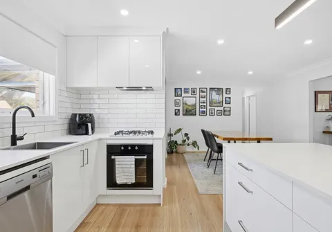 Behind the gated, double-brick facade, step into a light-filled lounge room featuring crisp white walls, LED downlights, and modern timber-look flooring, creating a warm and inviting atmosphere from the moment you arrive. Flow seamlessly into the dining room and kitchen, where a sleek white design awaits, complete with a gas cooktop, dishwasher, and breakfast bar adorned with a stylish pendant light—making cooking a pleasure.