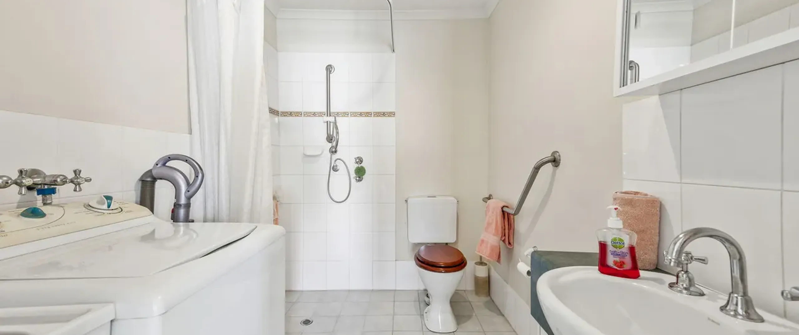 - Functional bathroom featuring vanity, shower, toilet and integrated laundry facilities
