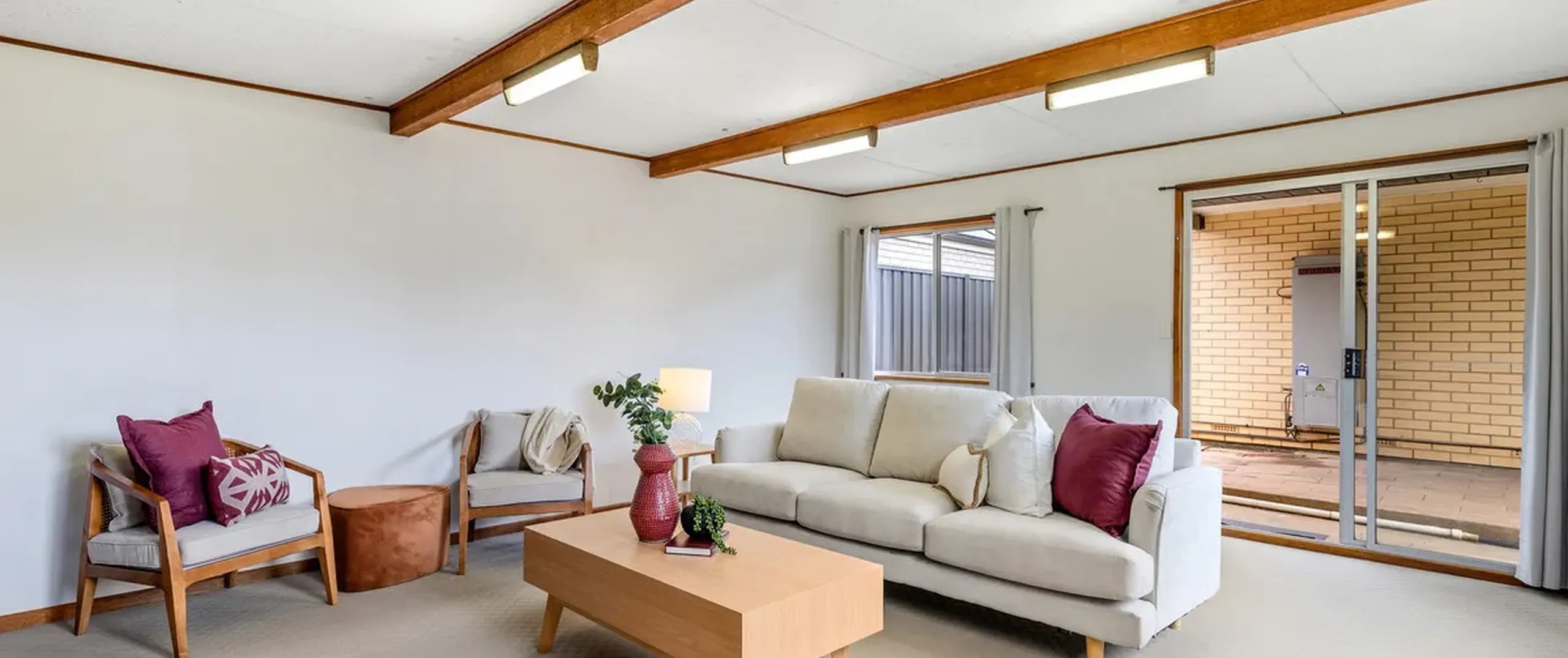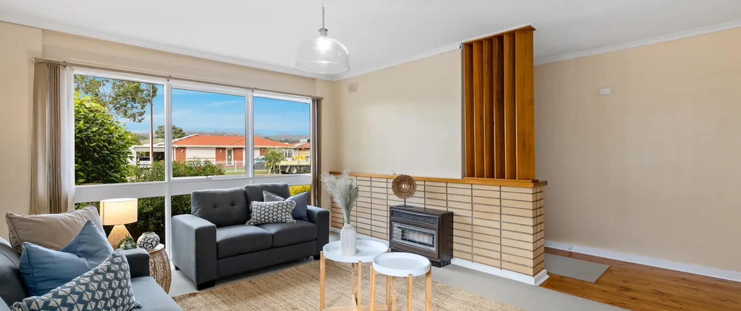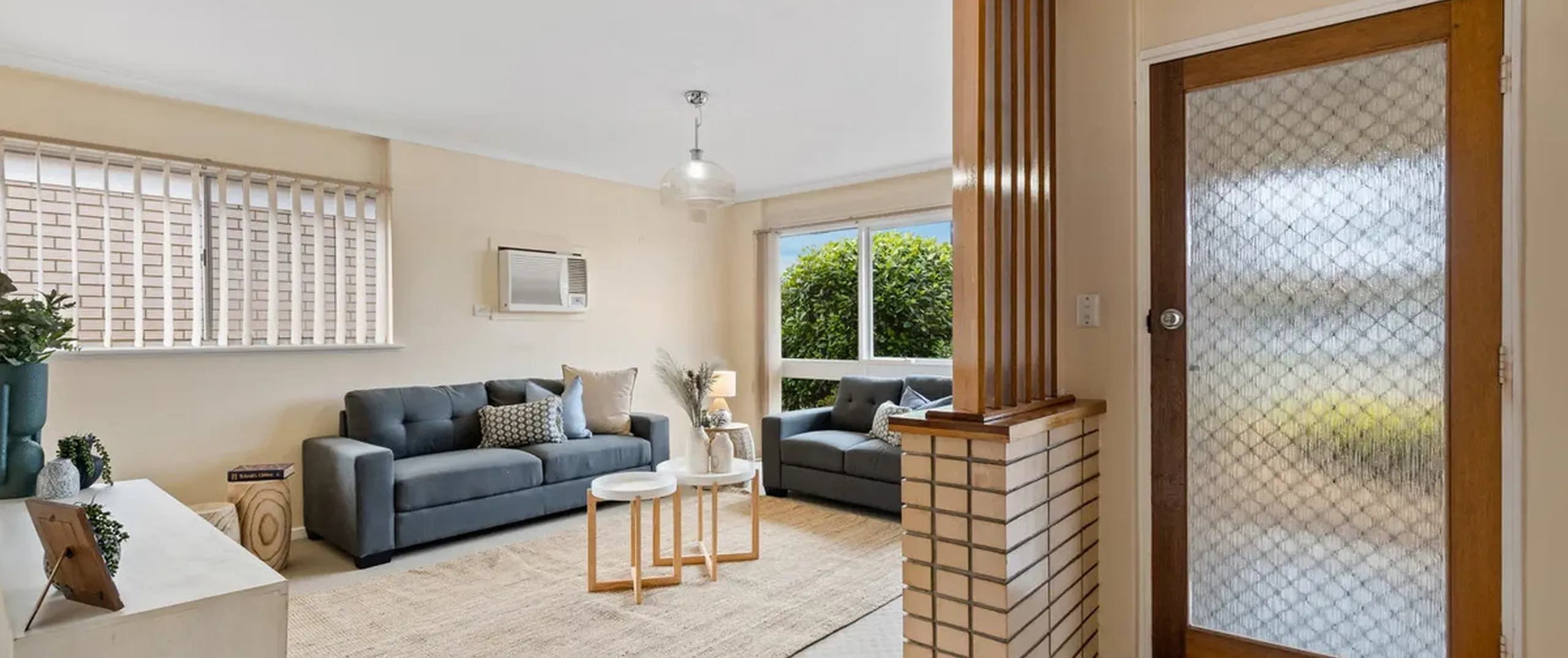 - Large light filled living area with gas space heater and air-conditioner for year round comfort