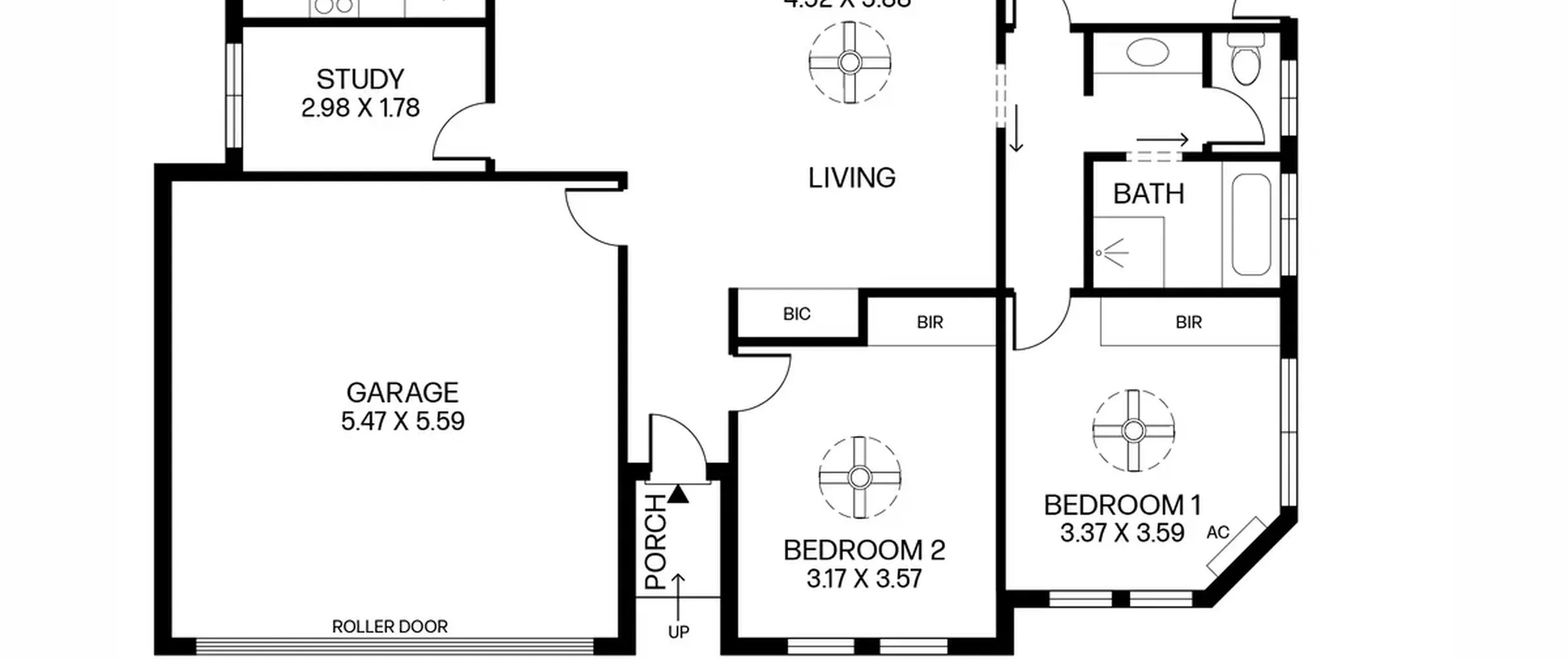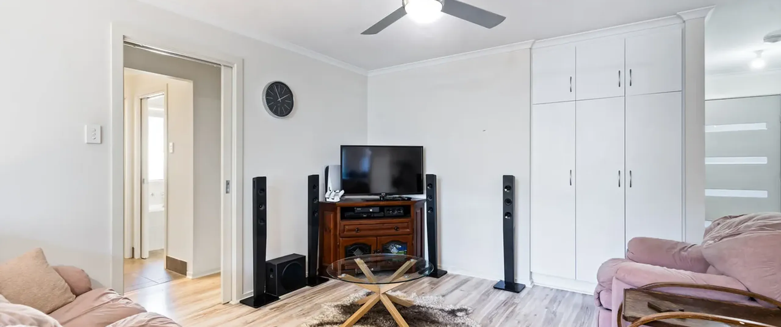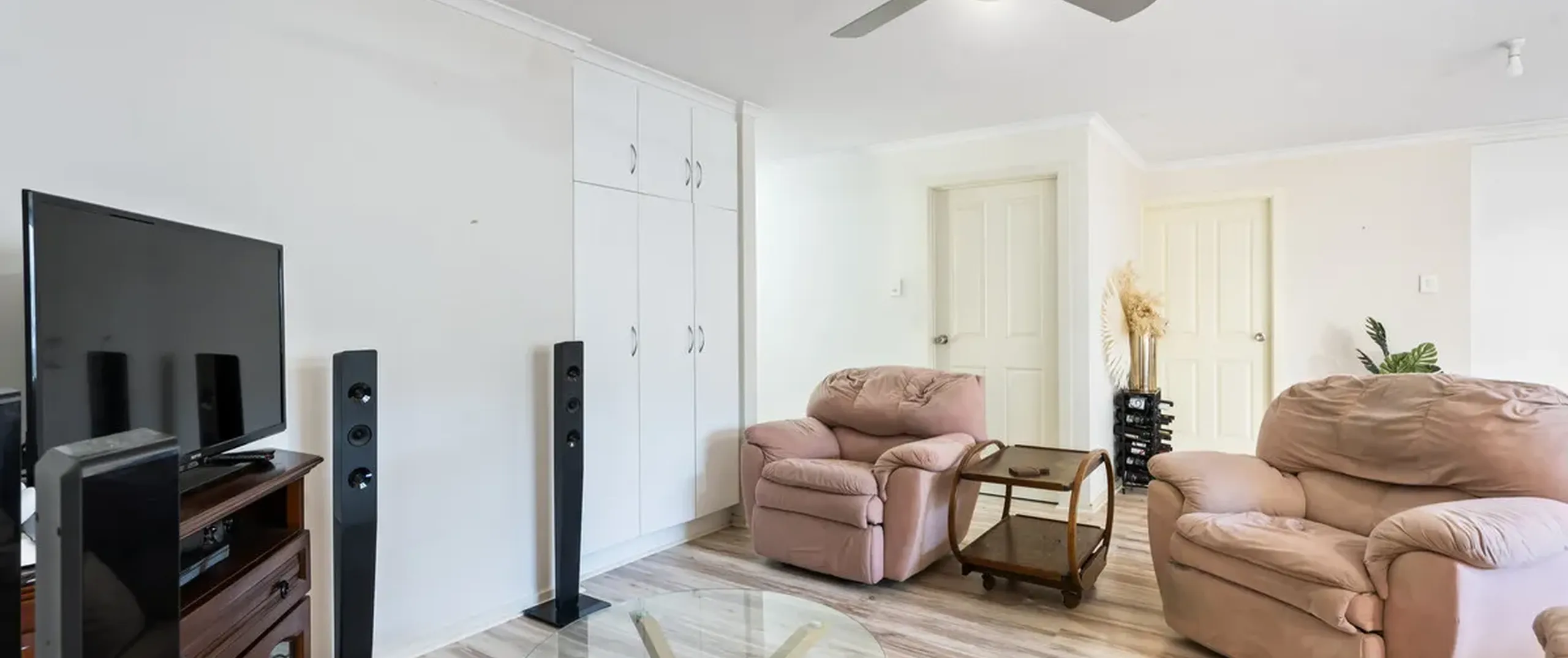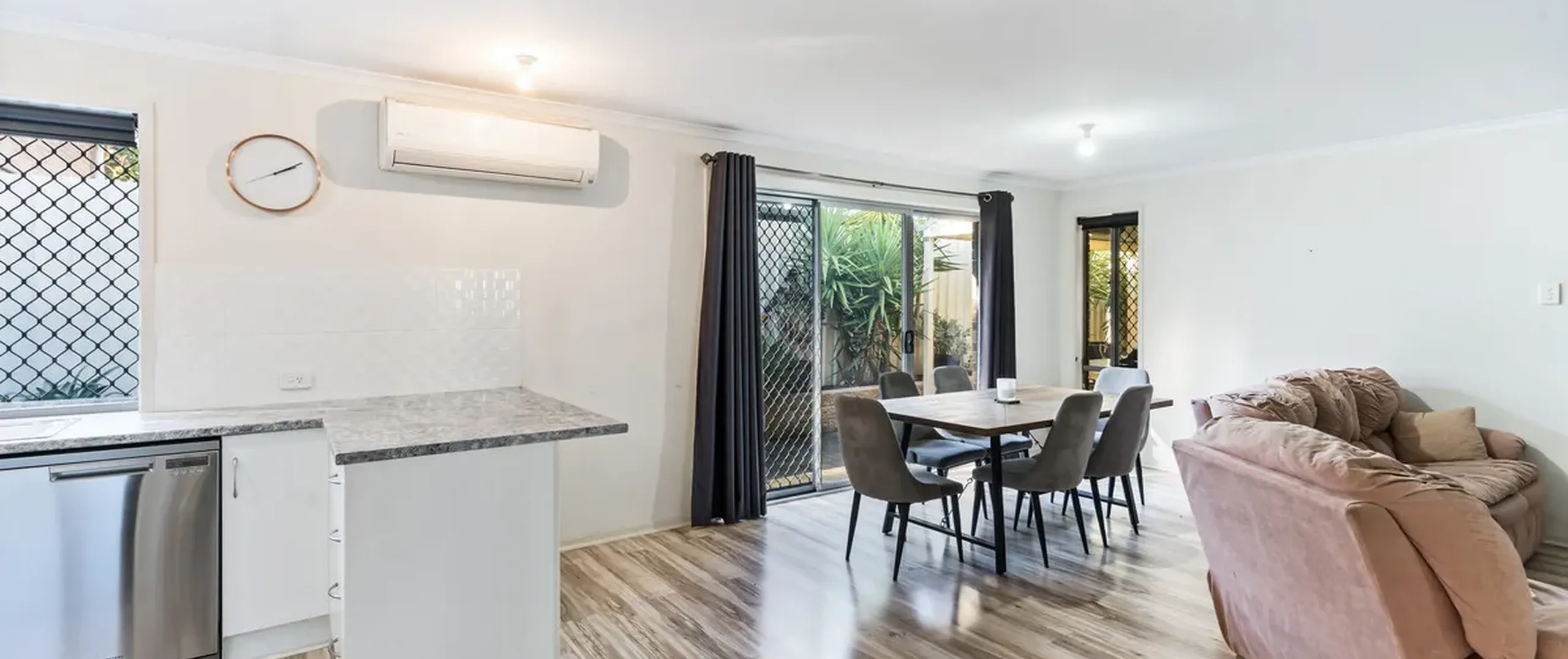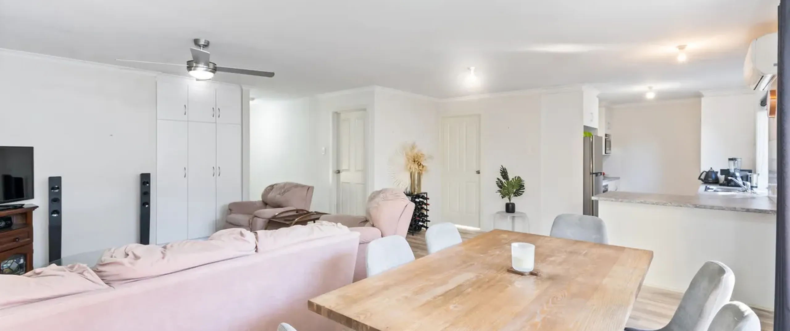 - Light-filled, open living and dining room with ceiling fan and air-conditioner