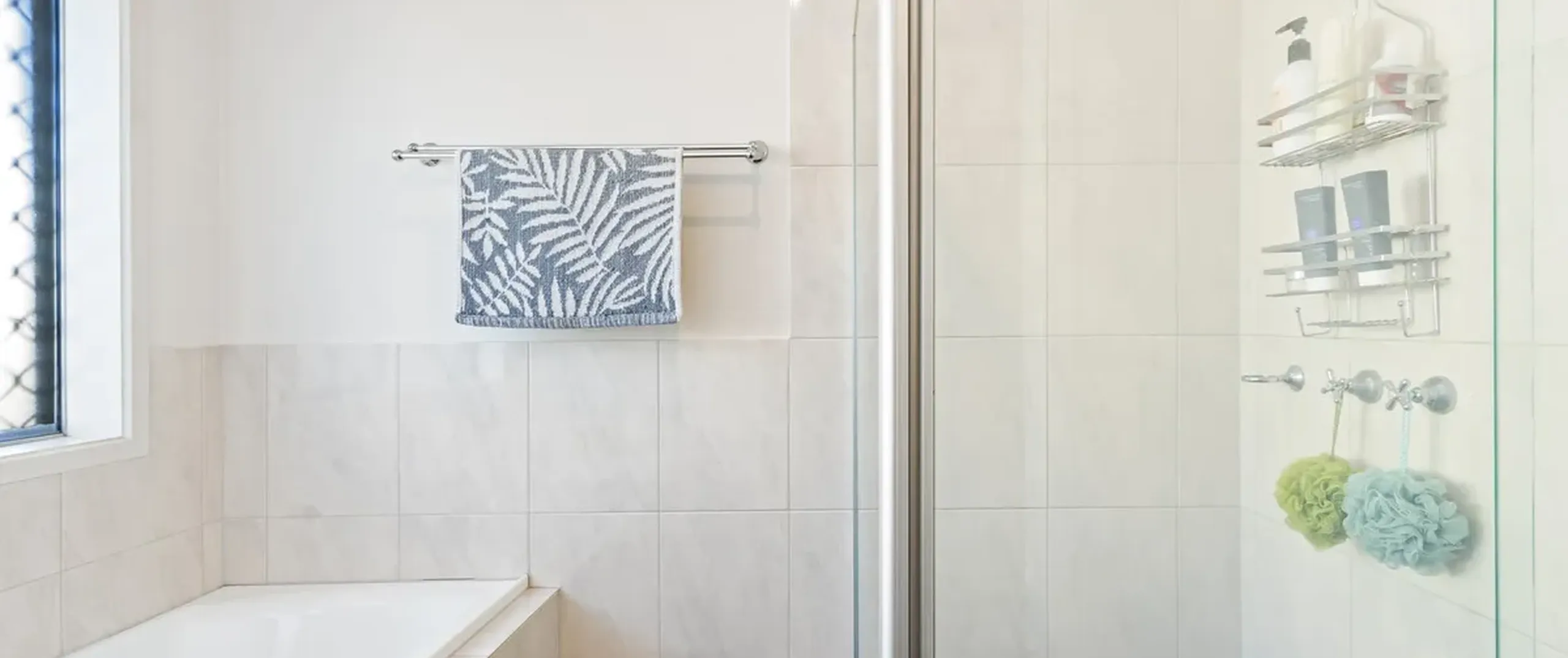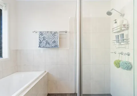 - Neutral three-way bathroom with bath and shower