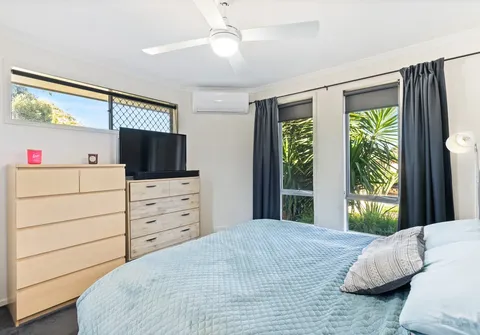 - Bedroom one with built-in robe, ceiling fan and split-system air-conditioner