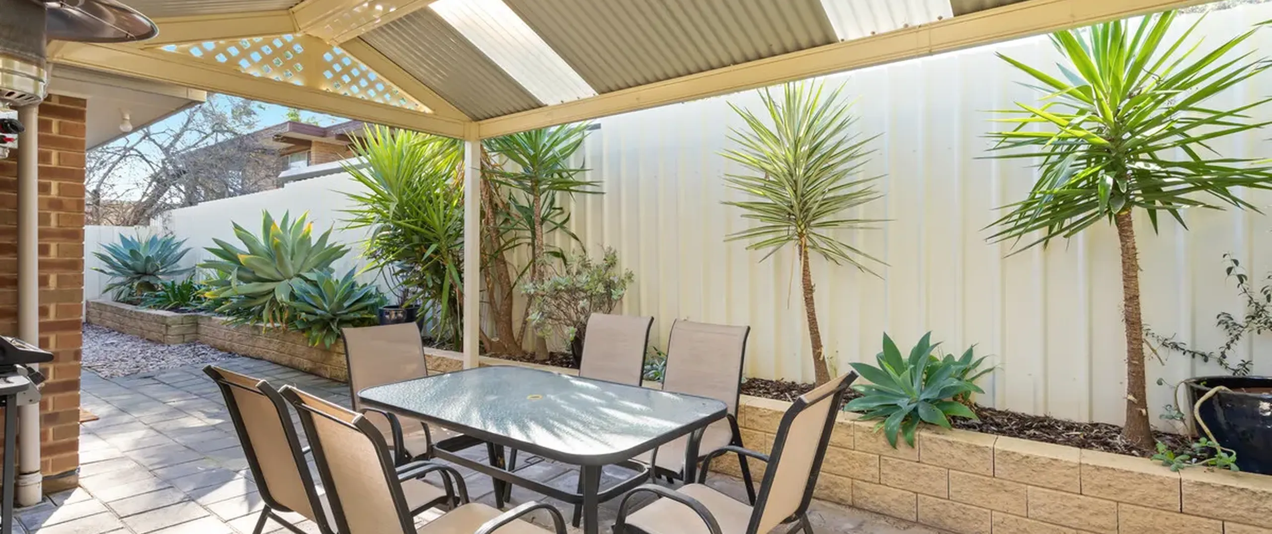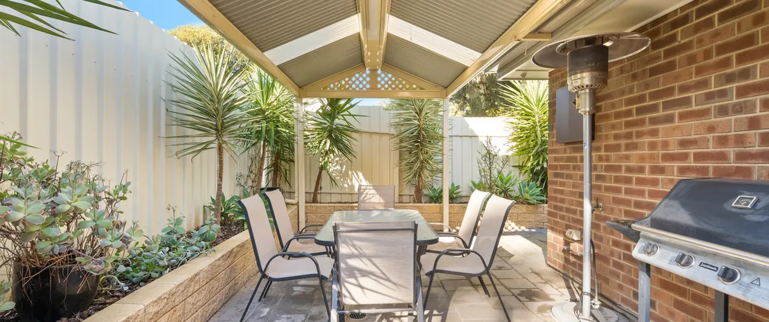 - Outdoor entertaining area with pitched roof pergola surrounded by stunning low-maintenance gardens, perfect for hosting guests