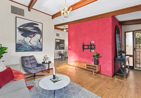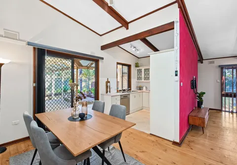 A generous lounge room greets you upon entry, adorned with exposed wooden beams, adding a touch of character to the space. The avid home chef will find delight in the thoughtfully designed kitchen offering a suite of stainless-steel appliances, with seamless connection to the dining room with convenient access to the verandah.