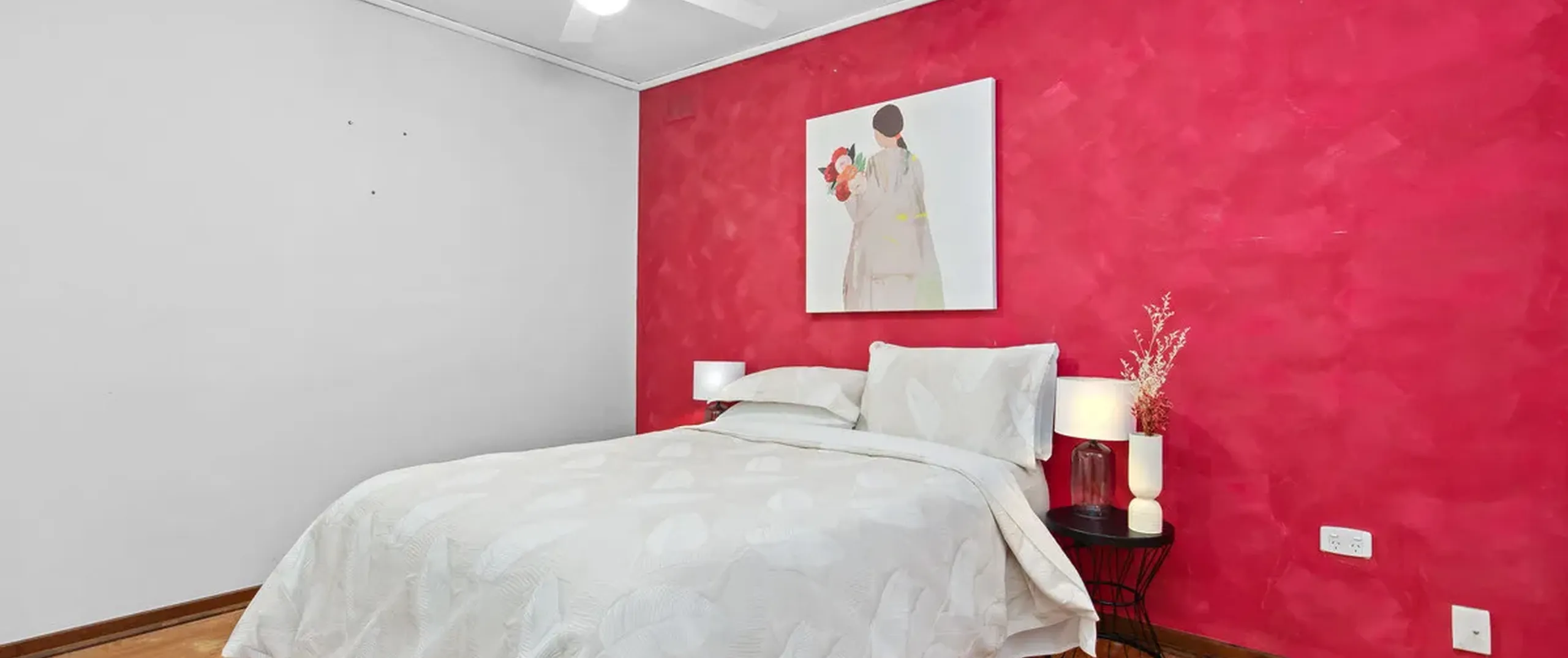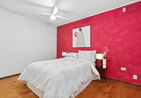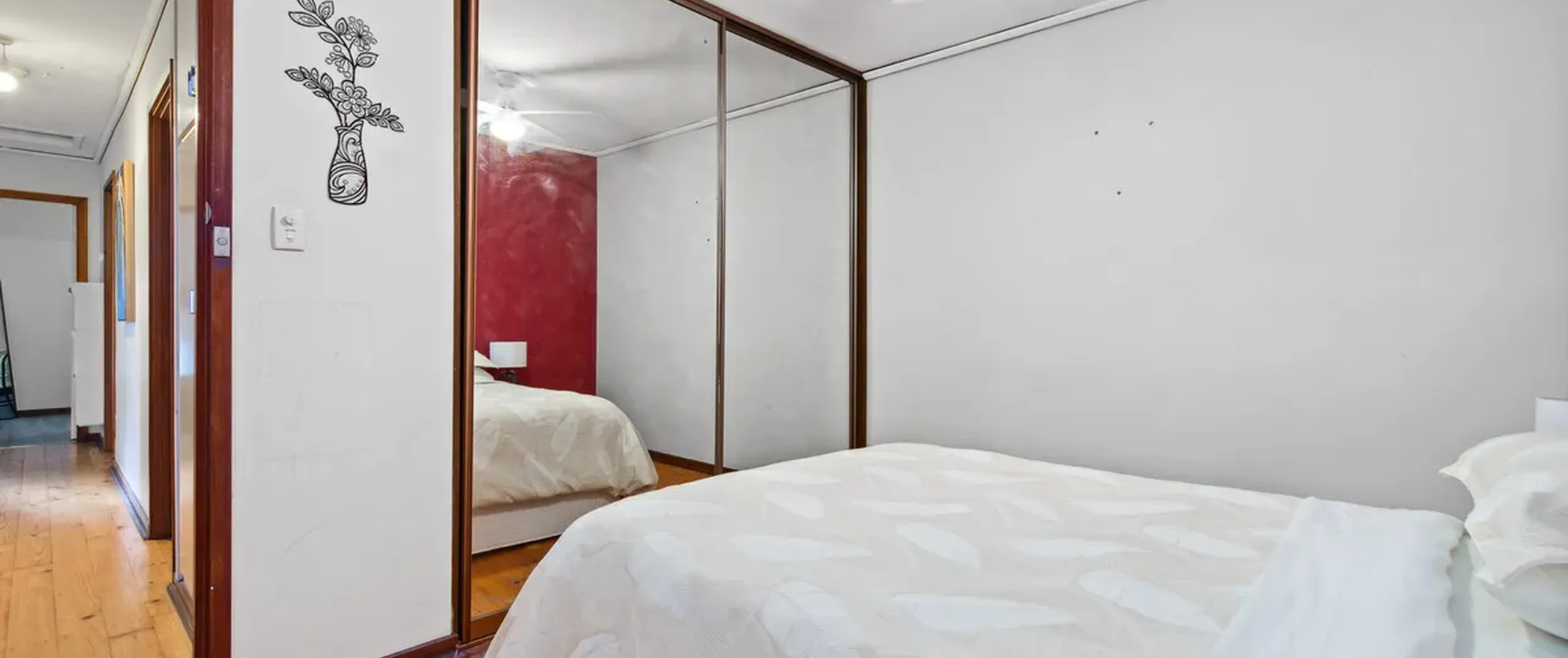 - Large master bedroom with mirrored built-in robe and ceiling fan