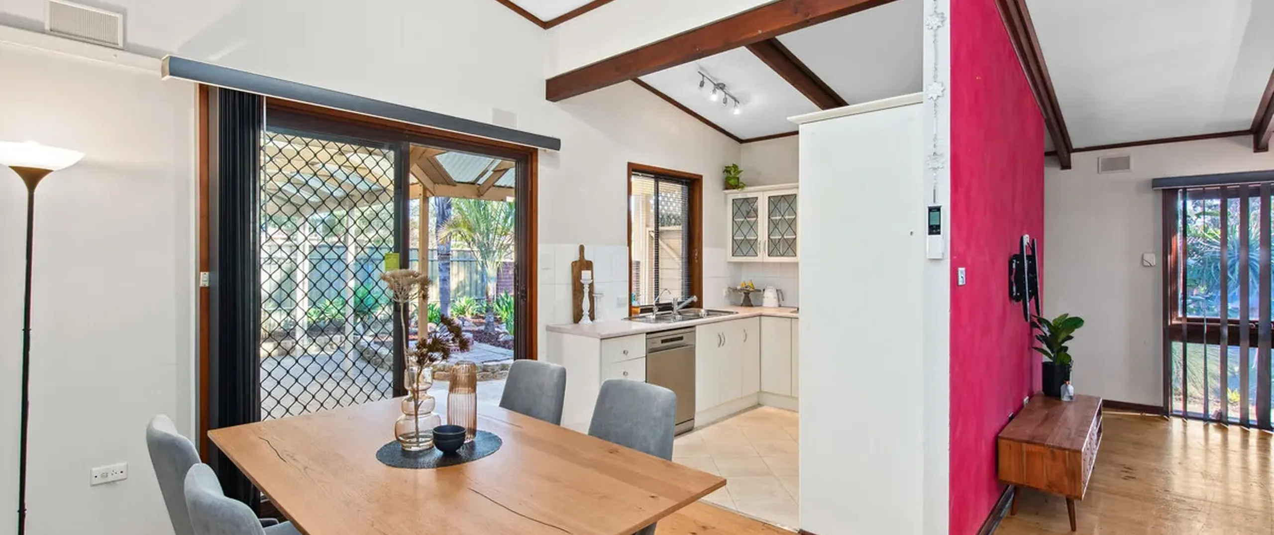 - Dining room adjacent to kitchen with ceiling fan and seamless connection to the verandah