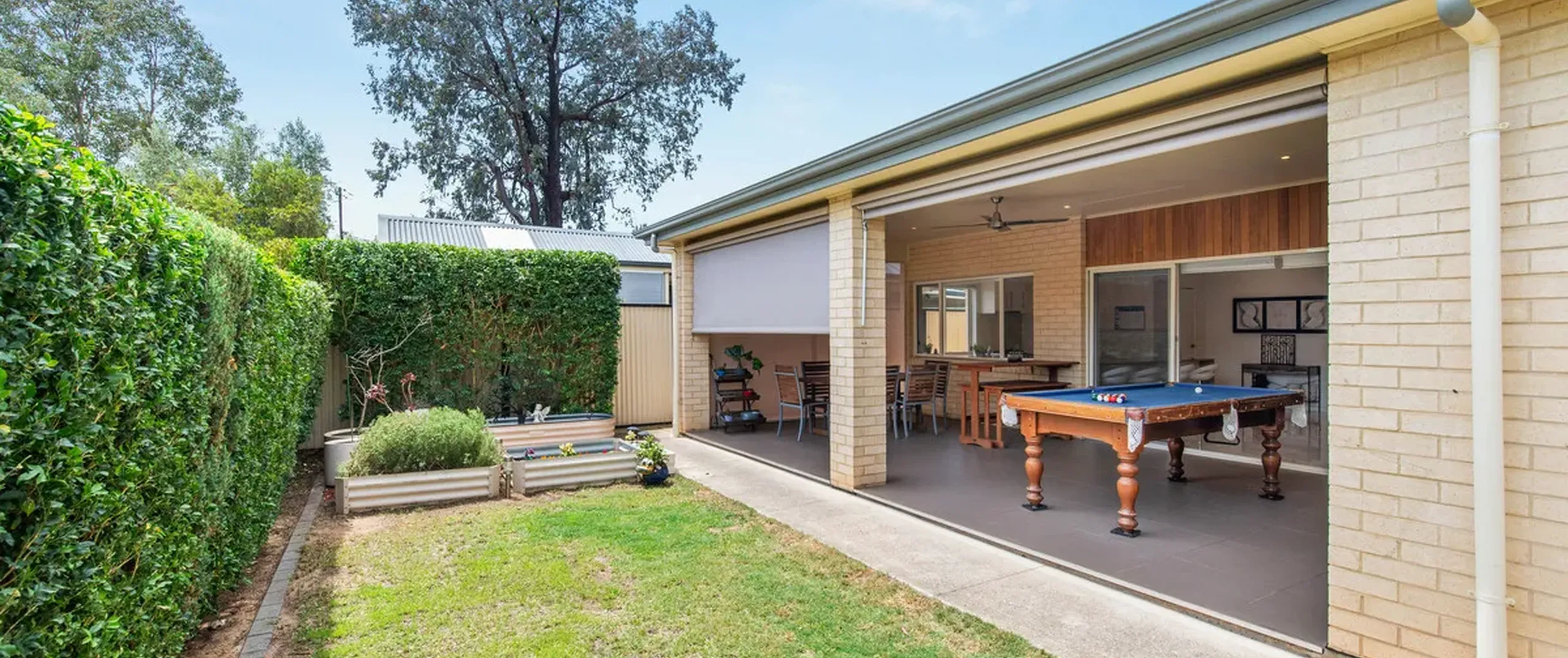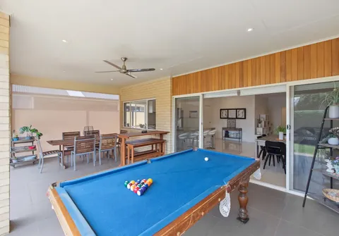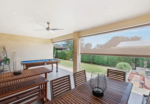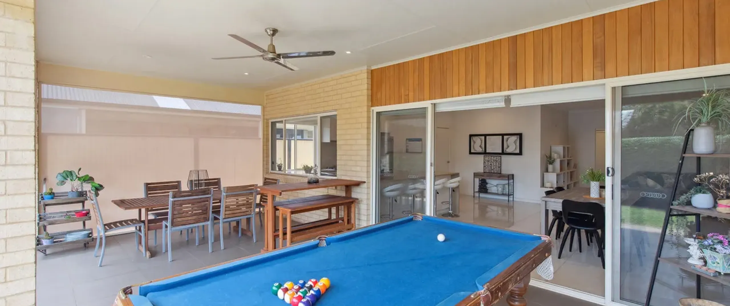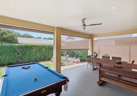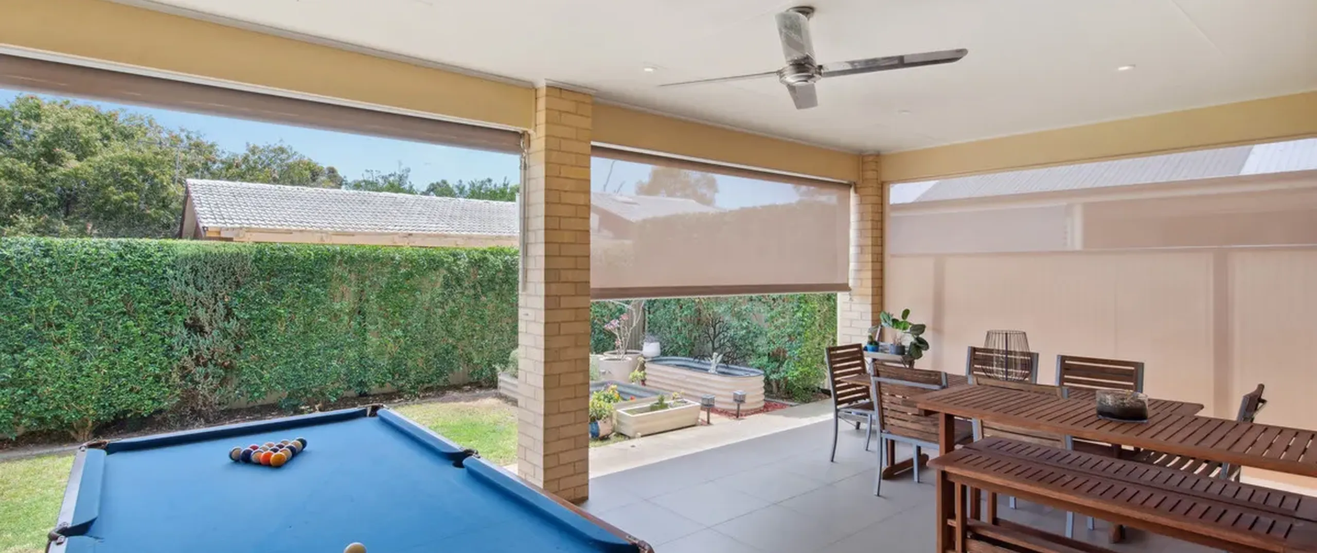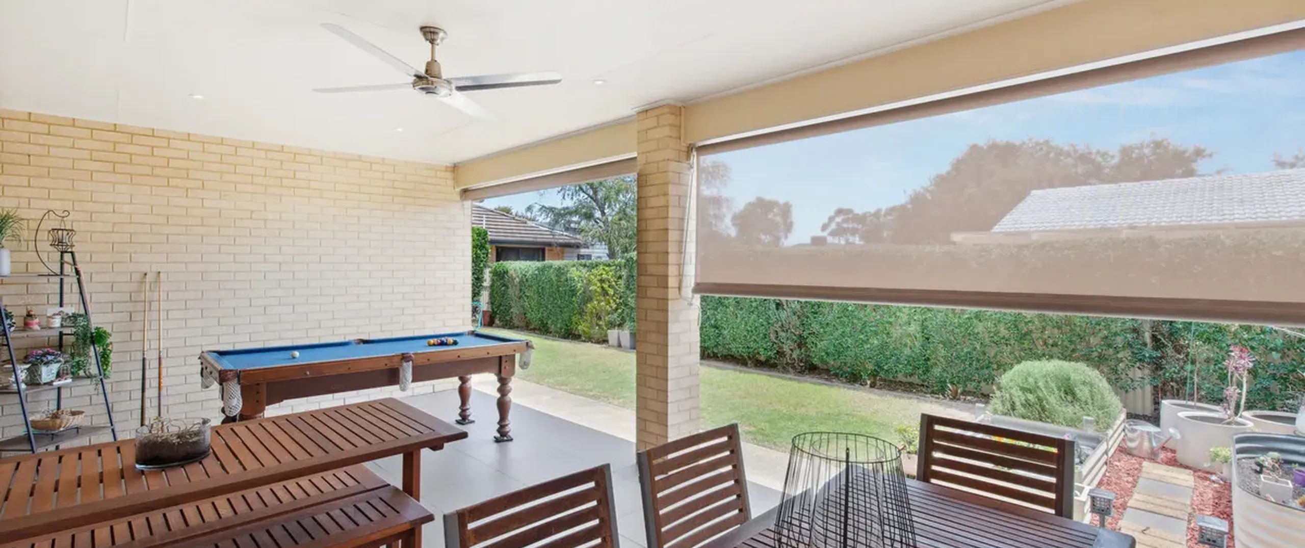 - Outdoor alfresco with ceiling fan, downlights and café’ blinds