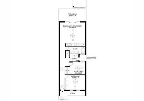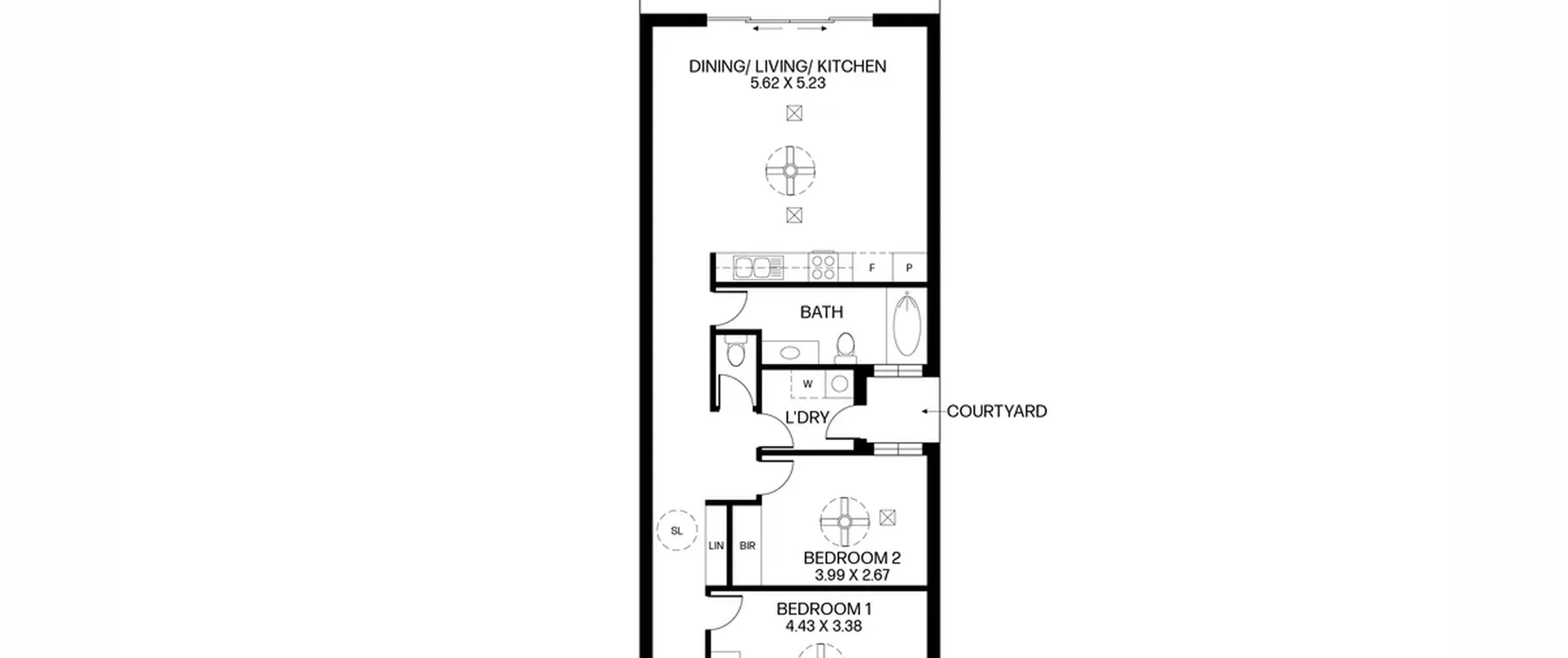 - Open-plan kitchen, living, and dining area with a ceiling fan and sliding doors for seamless indoor-outdoor flow to the courtyard