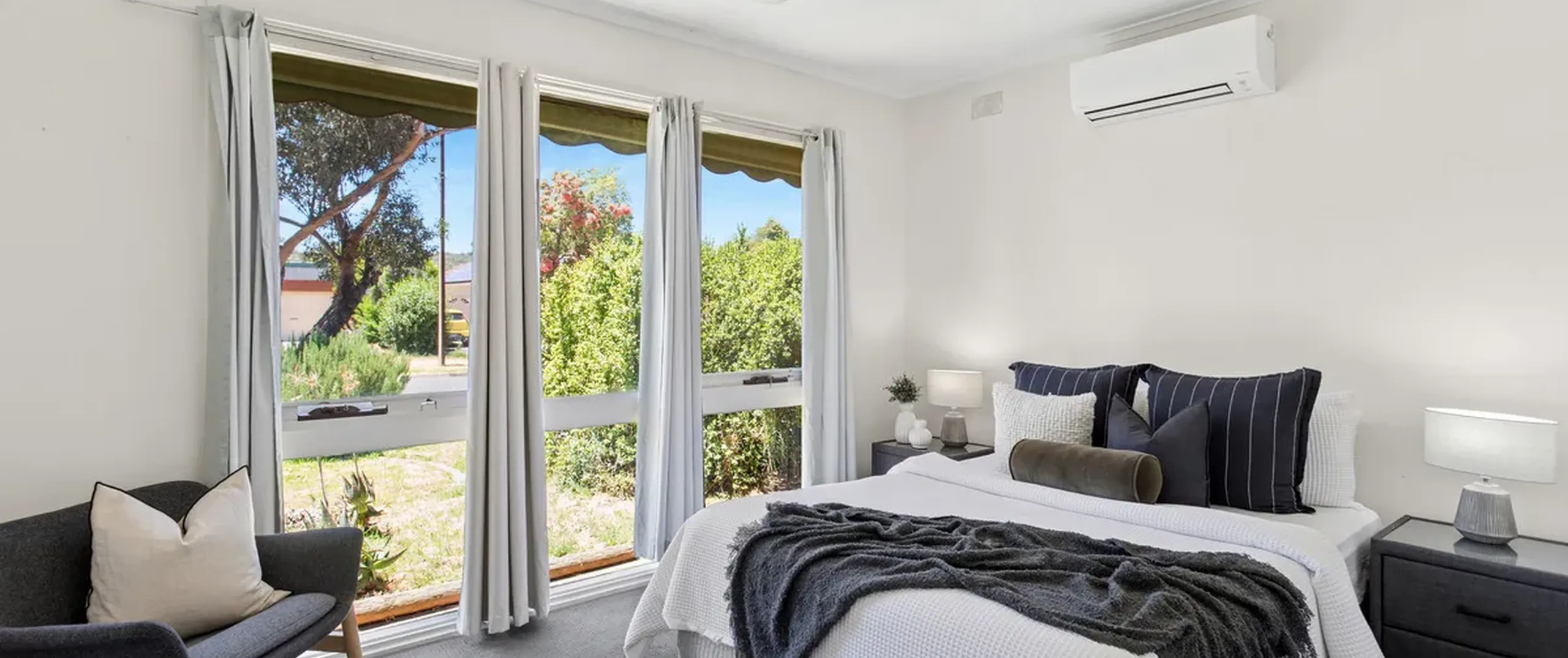 - Light-filled main bedroom with split system air conditioner, ceiling fan and built in robe