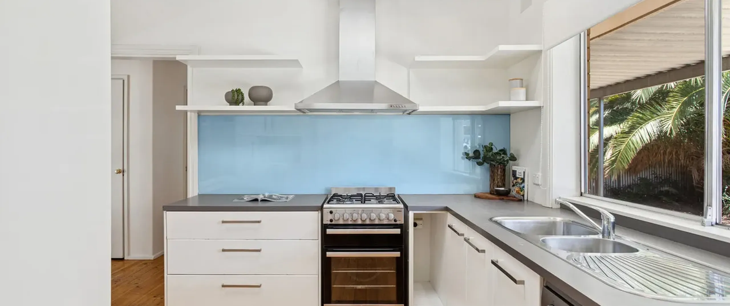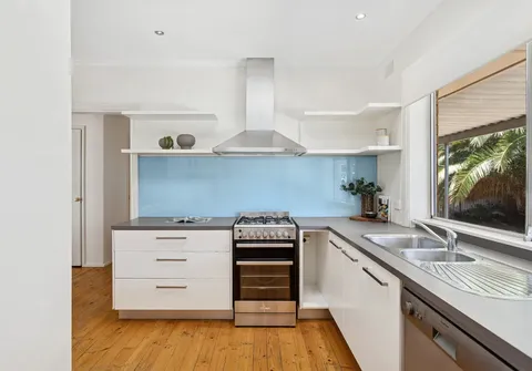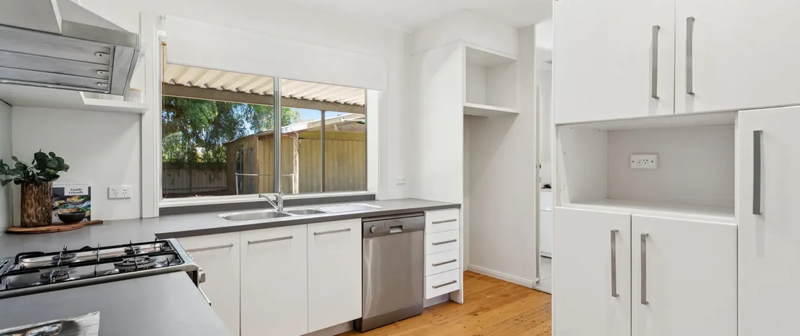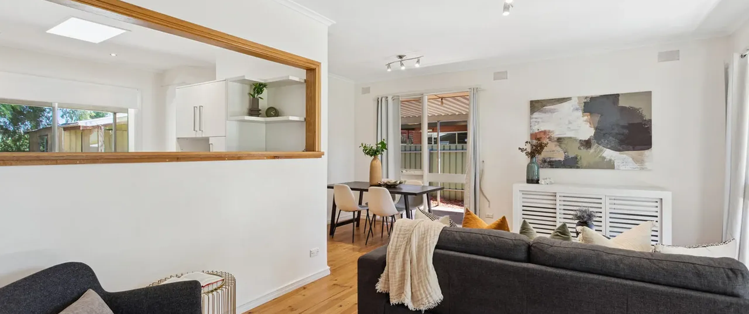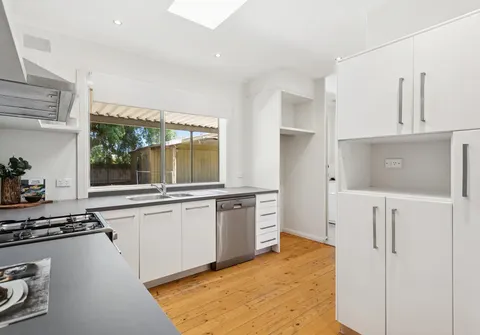 The spacious living area flows effortlessly into the dining space, forming an inviting hub for everyday living. Overlooking the rear yard, the large kitchen enjoys a strong connection to the living zones via a striking internal window, while a skylight enhances the bright and airy feel. Well equipped with a gas cooktop and oven, dishwasher, double sink and ample cupboard space, the kitchen is both practical and inviting.