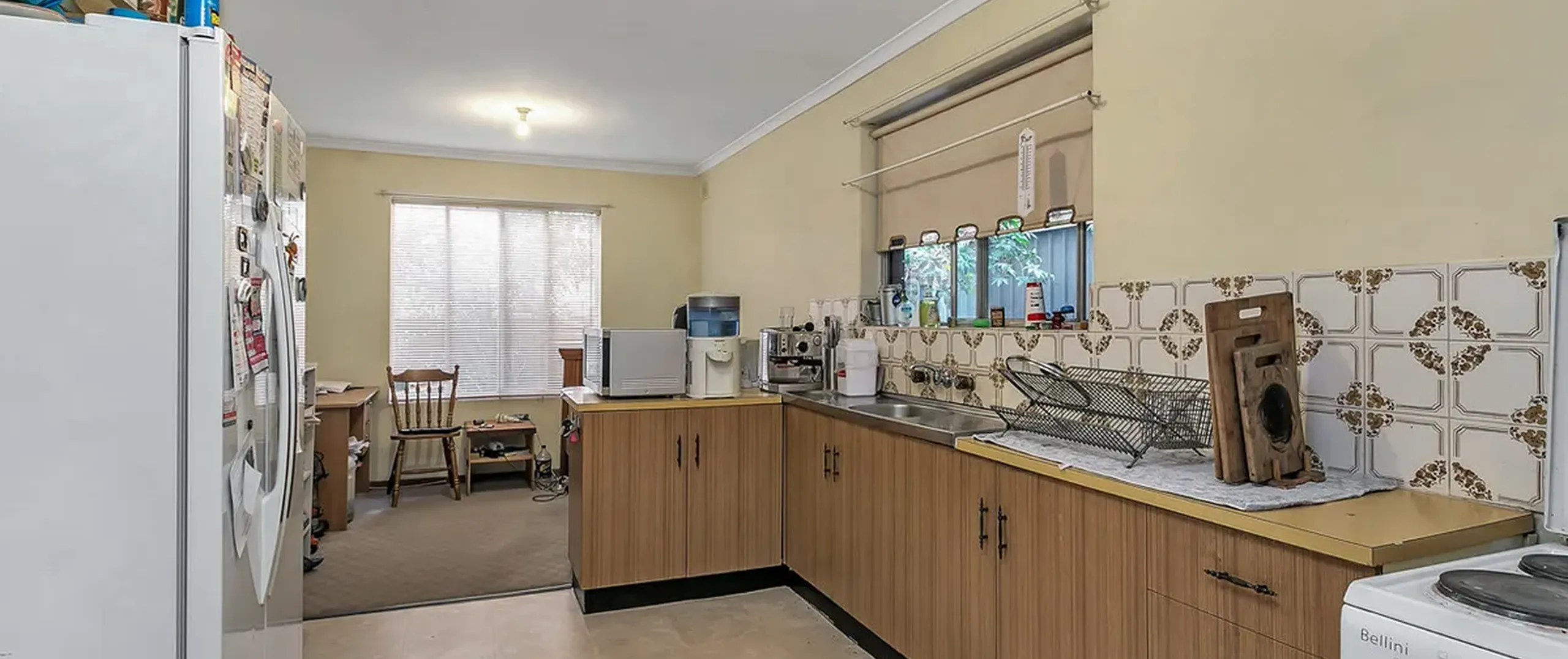 - Functional kitchen with electric oven and adjacent dining